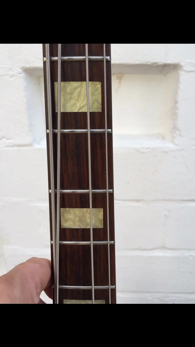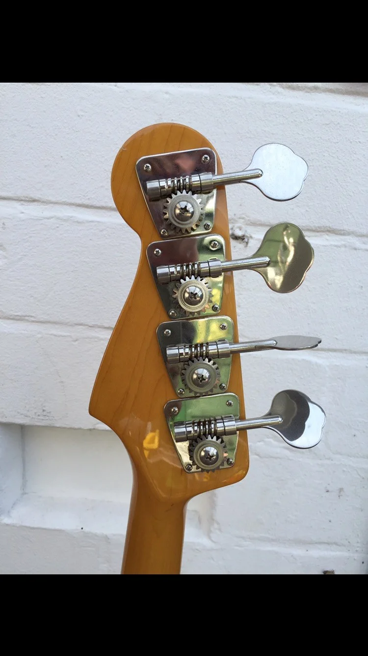Er hat die üblichen Spielspuren wie kleine Kratzer und ein größeren Dong an der Halsplatte, siehe Fotos. Das Gewicht müsste um und bei 4 KG liegen (gefühlt, habe keine Waage). Der Bass hat einen normalen Jazz Bass Hals und ist durch seine Schaltung sehr vielseitig im Sound.