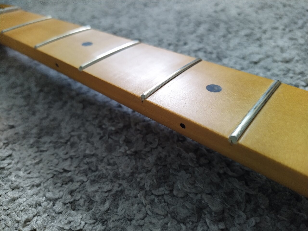 Ich habe den Hals neu gekauft und hatte ihn an einem MJT verbaut (siehe letztes Bild). Um den neuen Hals passend zum Body zu machen habe ich ihn mit feiner Stahlwolle mattiert. Zusammen mit den Gotoh FB30 Tunern, die am Werk aged sind, passt er prima zu Bodies die schon Spielspuren haben.