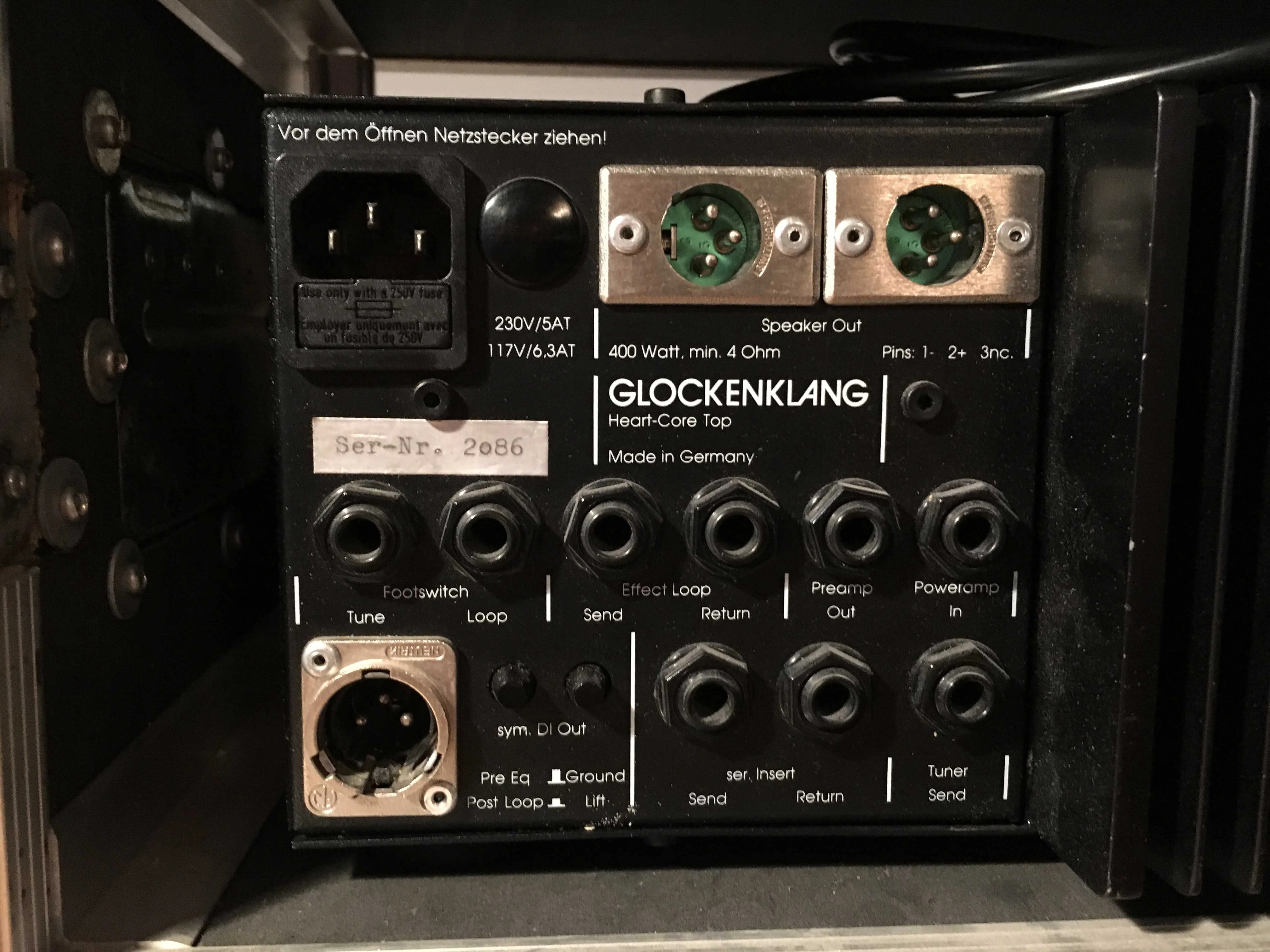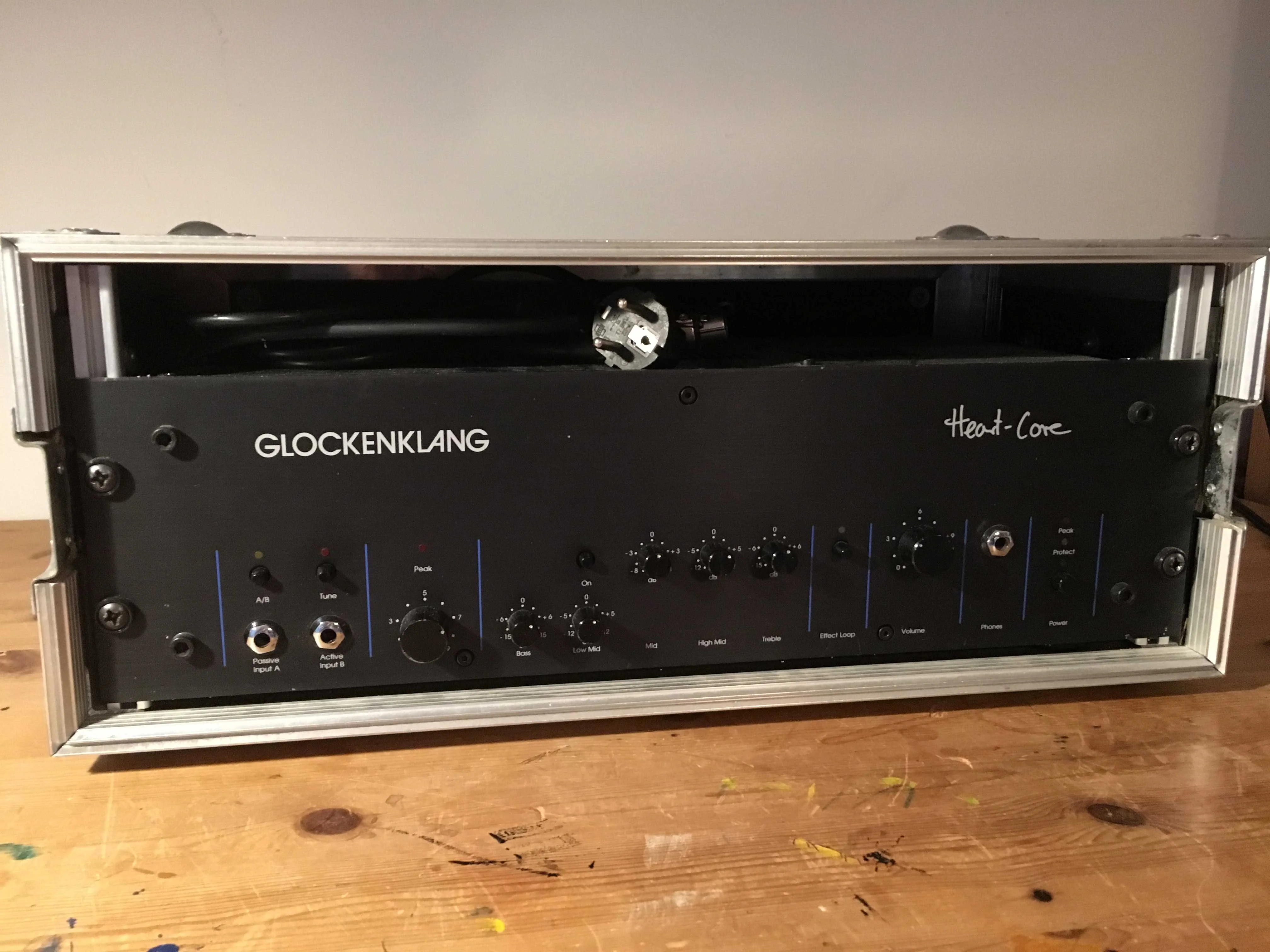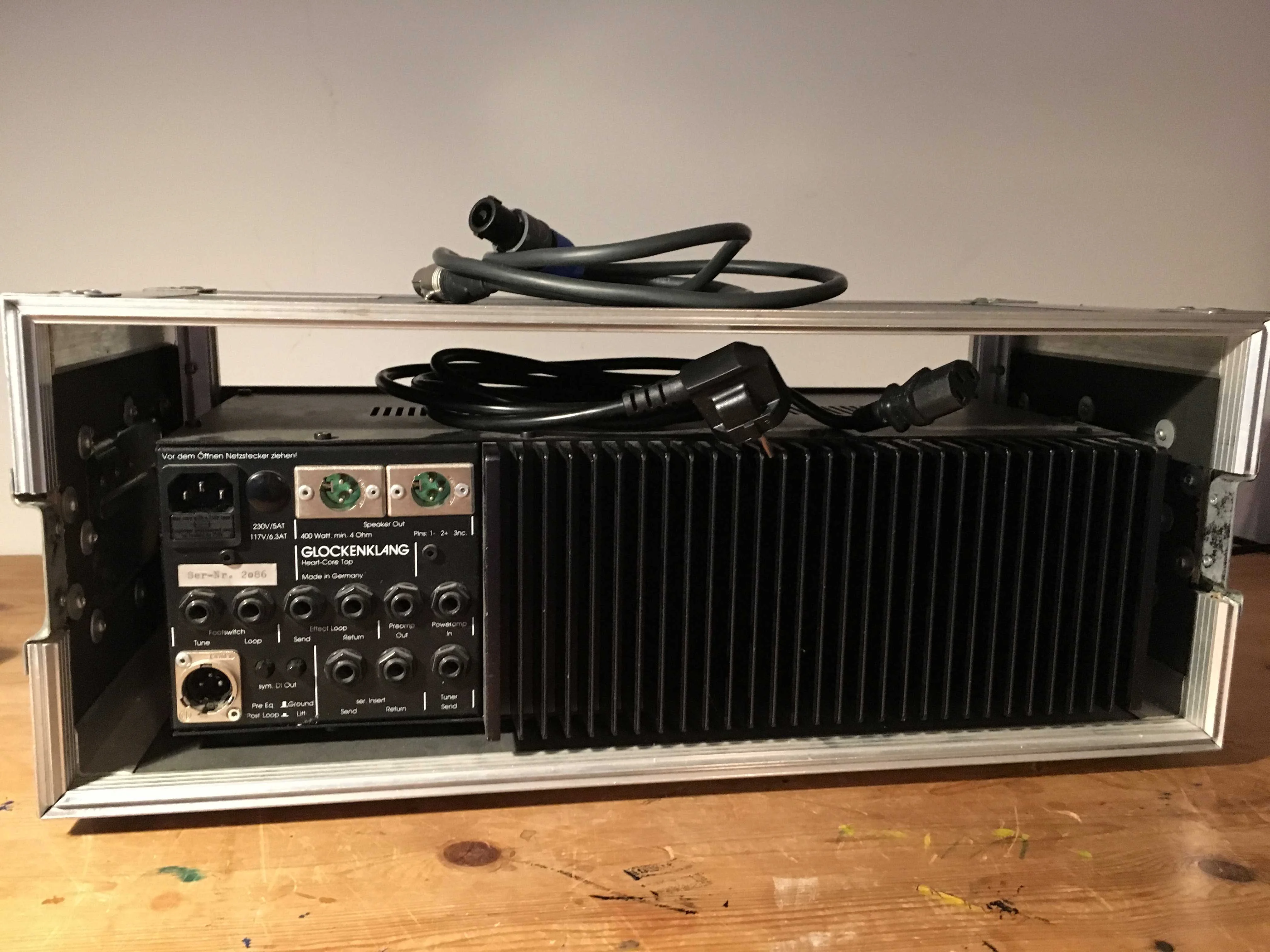 Der Amp wurde immer im mitgelieferten Case (4 HE) transportiert. Beim Case sind allerdings auf der einen Seite die Nieten locker. Kann man sicher einfach reparieren. Für den Versand werde ich den Amp mit Styropor auspolstern.
