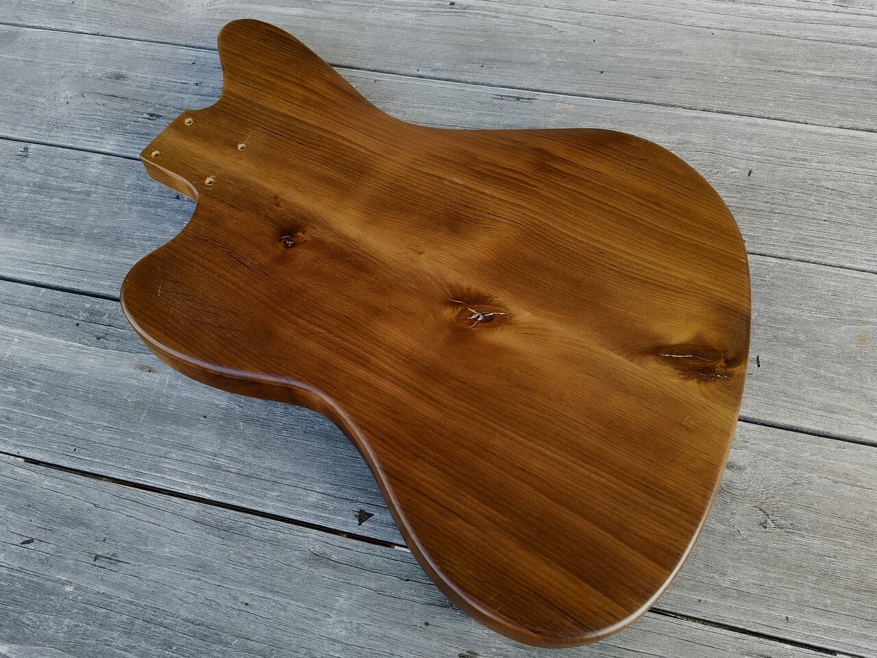 Der Body ist aus gerösteter Erle und ist geölt und wiegt 2,3kg. Die Halstasche ist passend für Fender / Squier. Bohrungen für die Brücke sind auf 34" / Longscale ausgelegt. Er ist mir neulich aus den (Ebay-) Kleinanzeigen zugelaufen, und da ich noch nie einen Jaguar hatte wollte ich das mal...