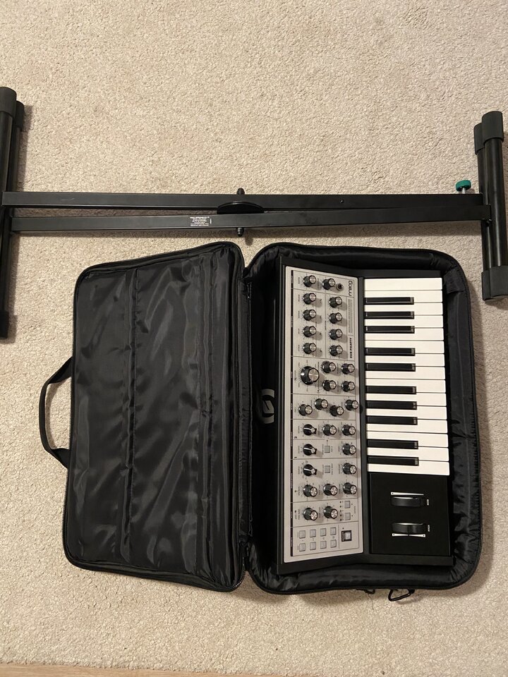 Dazu gibt es die Original Moog Gigbag (wird unglaublich hoch angeboten da nicht mehr bestellbar) und einen passenden K&M Ständer.