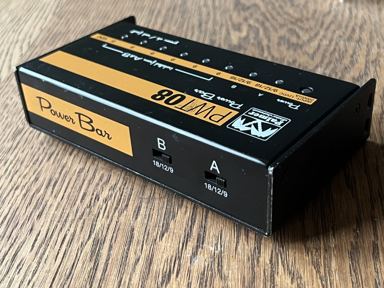 Mehrfach-Stromversorgung des deutschen Herstellers Palmer mit einer satten Stromleistung von maximal 2000 mA und acht 9V-Anschlüssen. Zwei von ihnen sind auf 12 bzw. 18 Volt schaltbar. Das ganze Ding ist winzig und wiegt gerade einmal 300 Gramm. Leichte Gebrauchspuren, unten ist Klett angebracht (wird auf Wunsch entfernt). Ich liefere diverse Kabel und ein Netzteil mit.