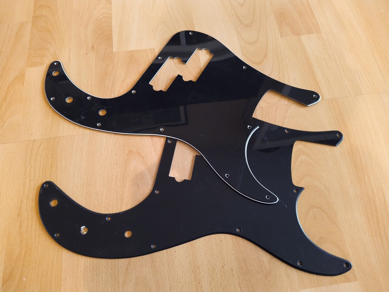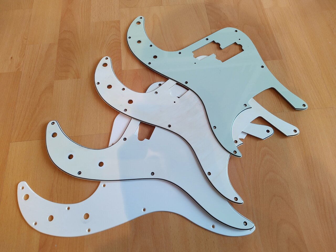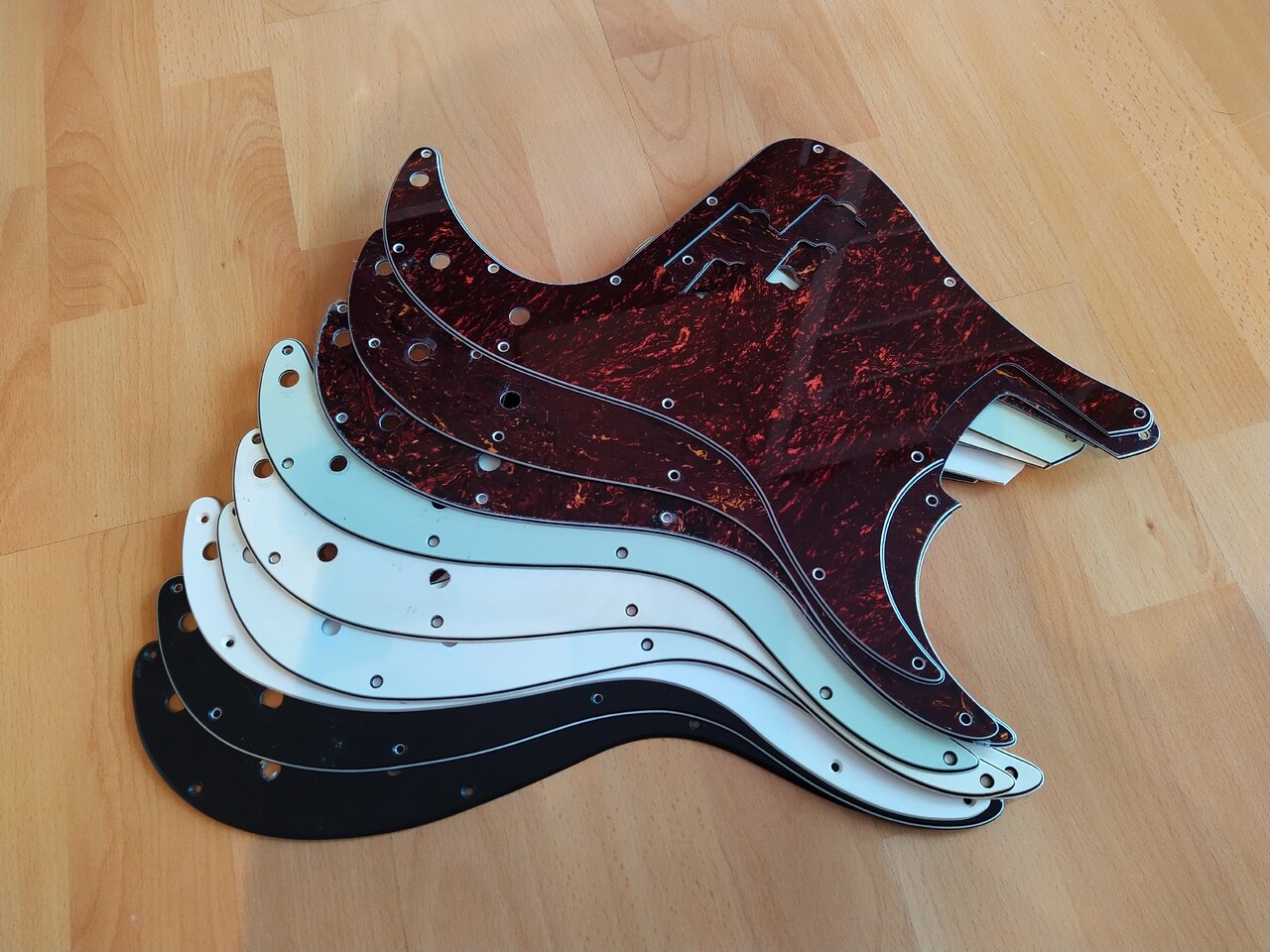 Die Pickguards sind teilweise benutzt oder angepasst, manche haben ein aging bekommen, andere sind neu und tragen noch die Schutzfolie. Hersteller kann ich nicht mehr genau zuordnen, manche sind Fender/Squier andere Musiclily oder Fleor.