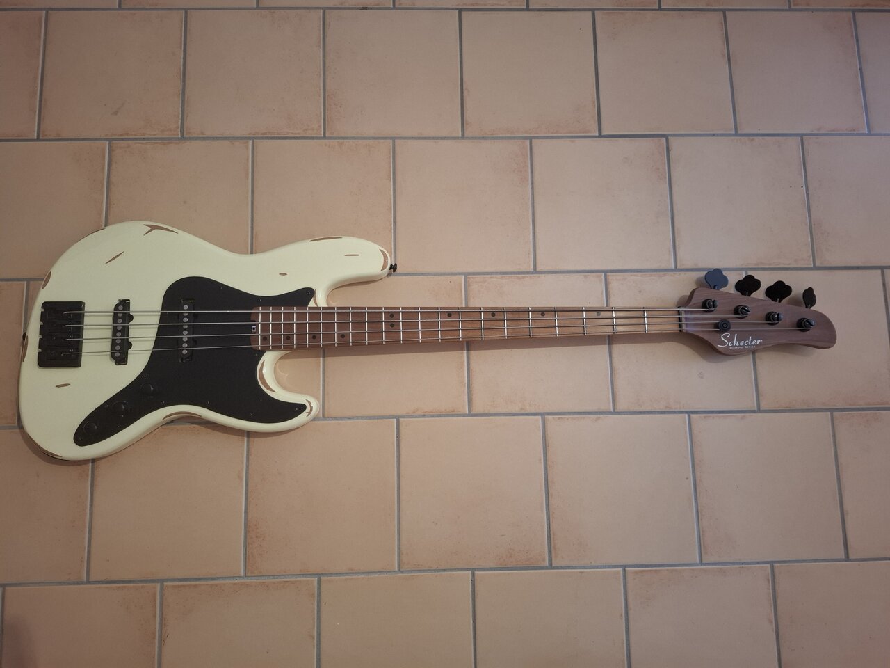 Verkleinere meine Bass Sammlung. Deshalb hier ein Schecter Diamond J-4 Sixx Relic Bass, Ivory, carbonverstärkter Hals, Schecter USA Monster Tone Pickups, 1 1/2 Jahre alt, (NP 1.600 Euro).