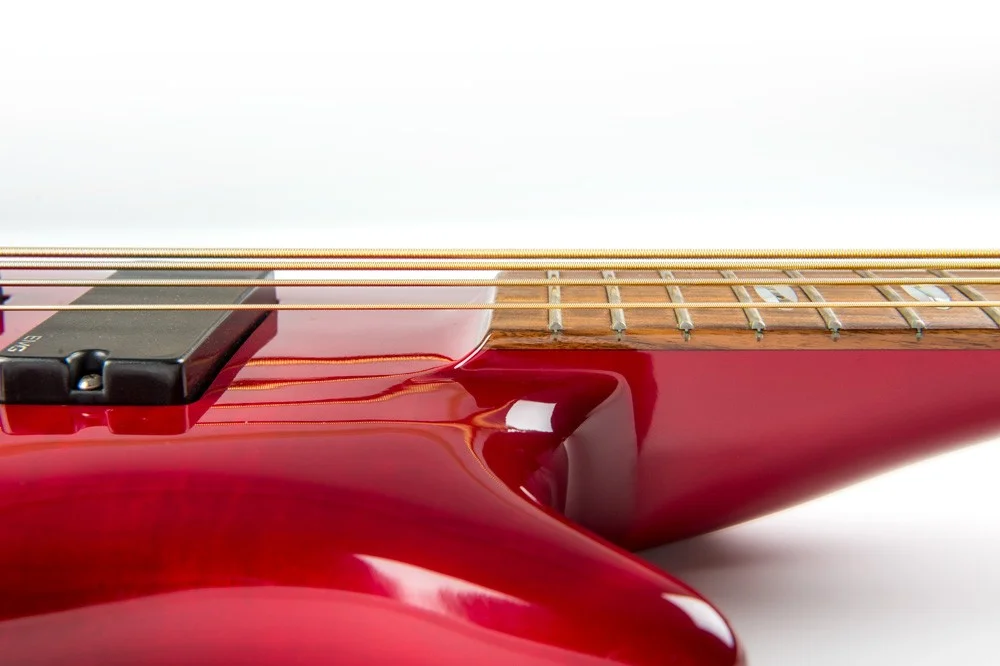 Der Gesamtzustand des Basses ist fantastisch, einzig eine winzige Macke und leichte Kratzer hinter der Bridge sind die einzigen Makel. Die habe ich auf einem Bild markiert.
