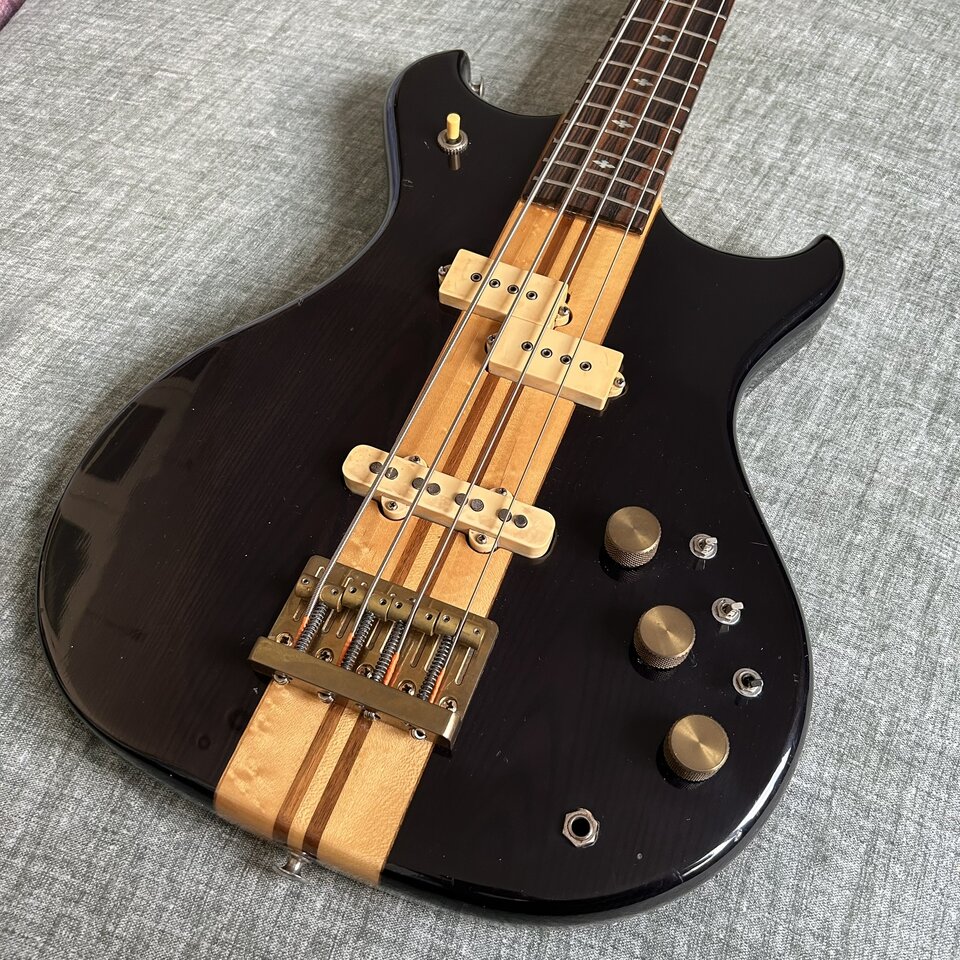 It's evient that the Japanese were heavily inspired by Alembics at this time. Here we have a neck thru body with a distinctive headstock tilt, a neck made of laminated maple and walnut, ash wings and a passive and active circuit...