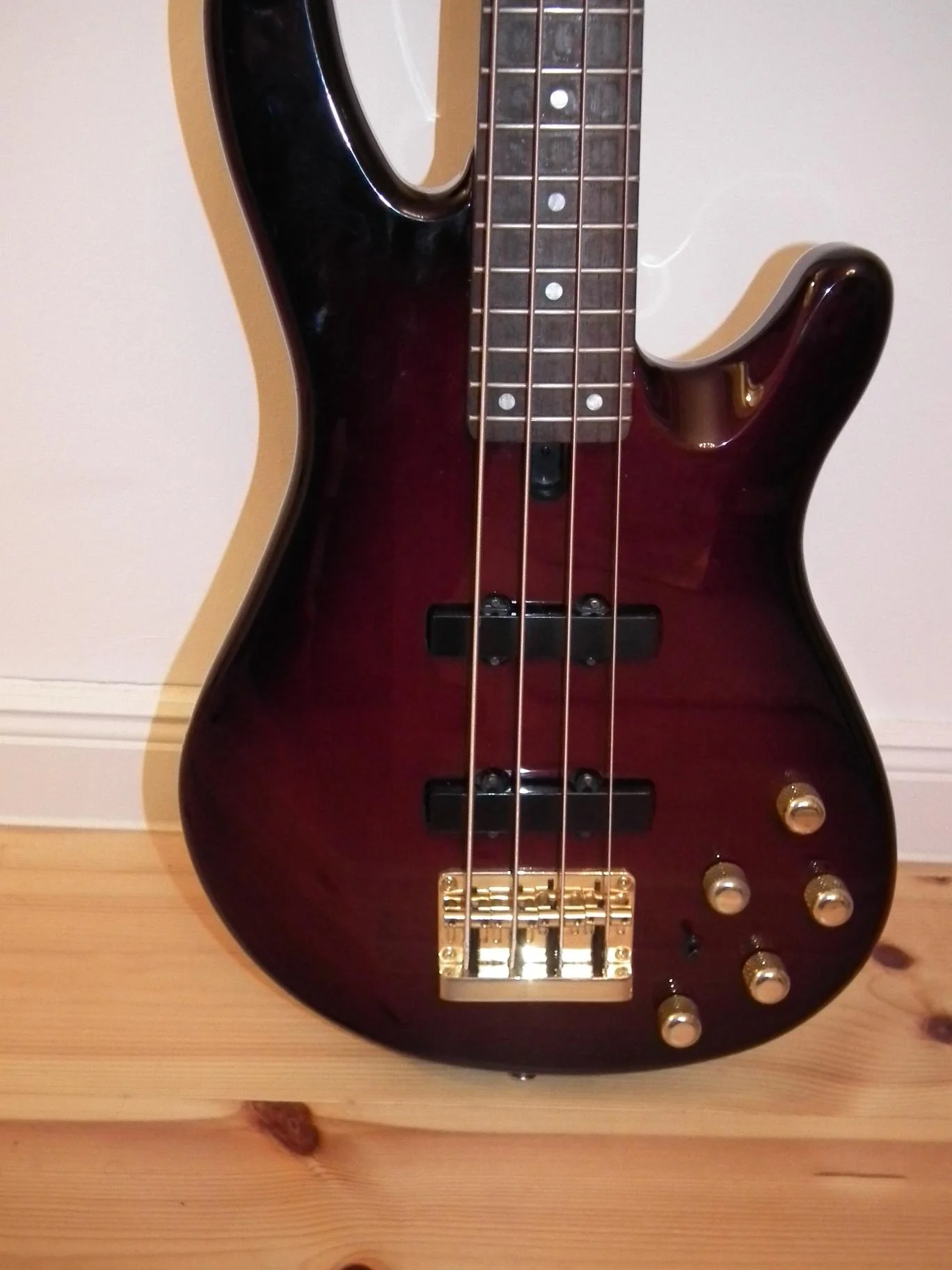 Yamaha BB604 in wine red burst, seit 2002 in meinem Erstbesitz. Über die Zeit hat der Hochglanzlack natürlich die eine oder andere Schliere bekommen, sind aber alles keine wirklich großen Sachen und mit der Kamera kaum festzuhalten... Technisch ist er soweit völlig einwandfrei, die Bundstäbe sollten auch noch eine Weile halten.