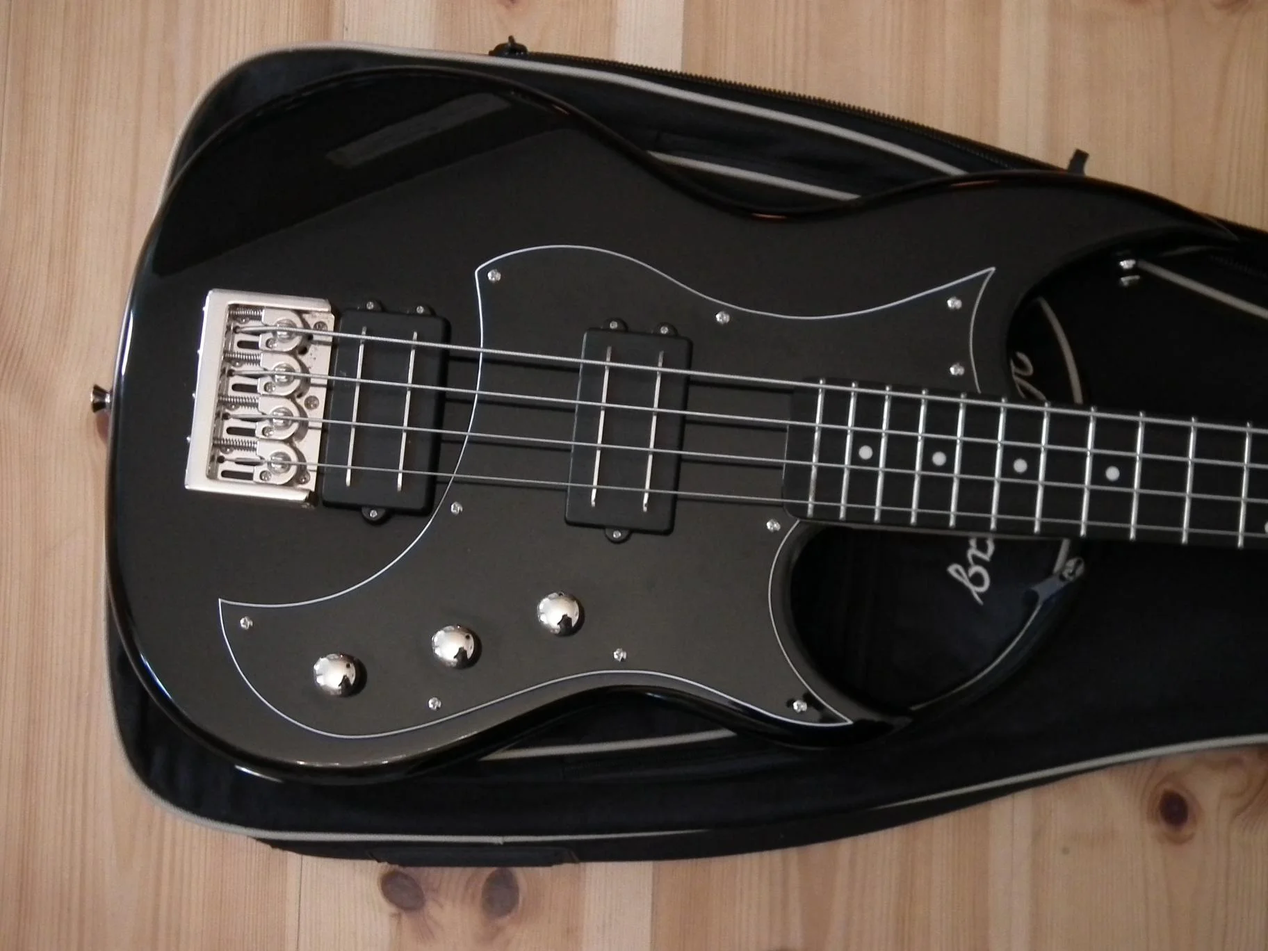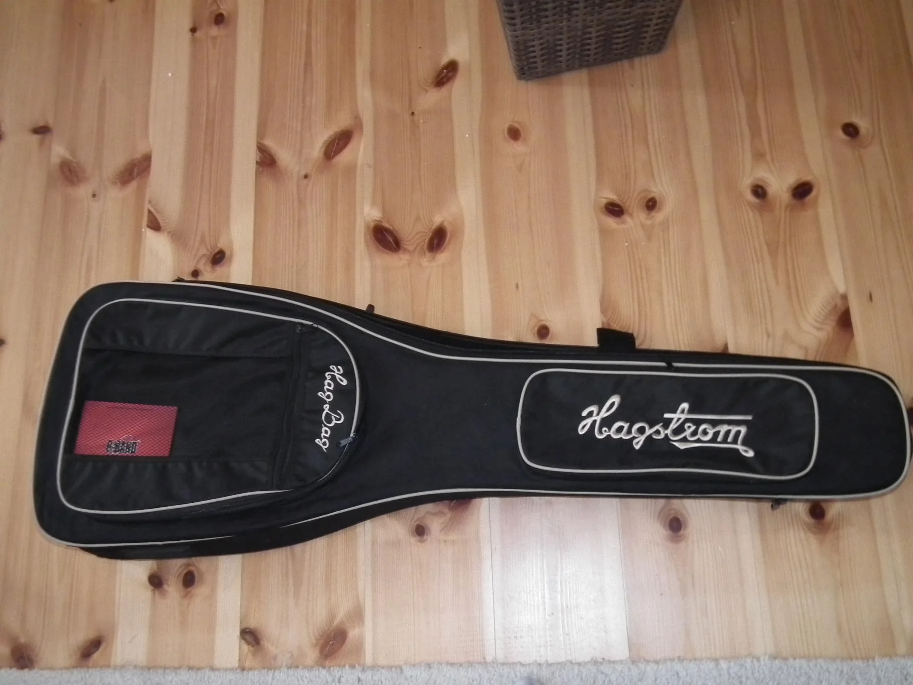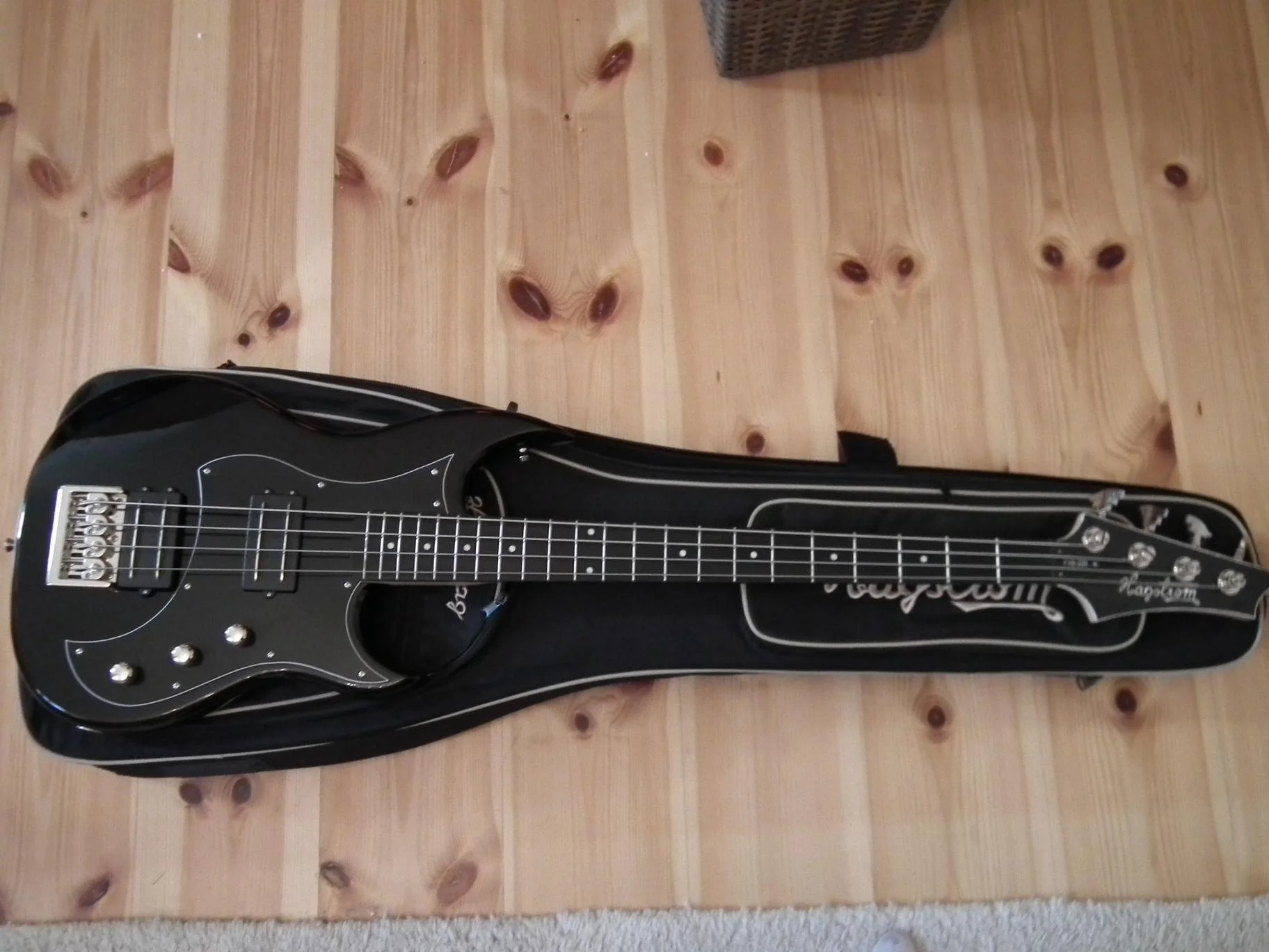 Hagstrom FXB-220 in schwarz. War ein Showroom-Modell, hat aber lediglich auf dem Schlagbrett ein paar Spielspuren. Inklusive HagBag, allerdings fehlt dem der seitliche Griff. Sonst ein Top GigBag!