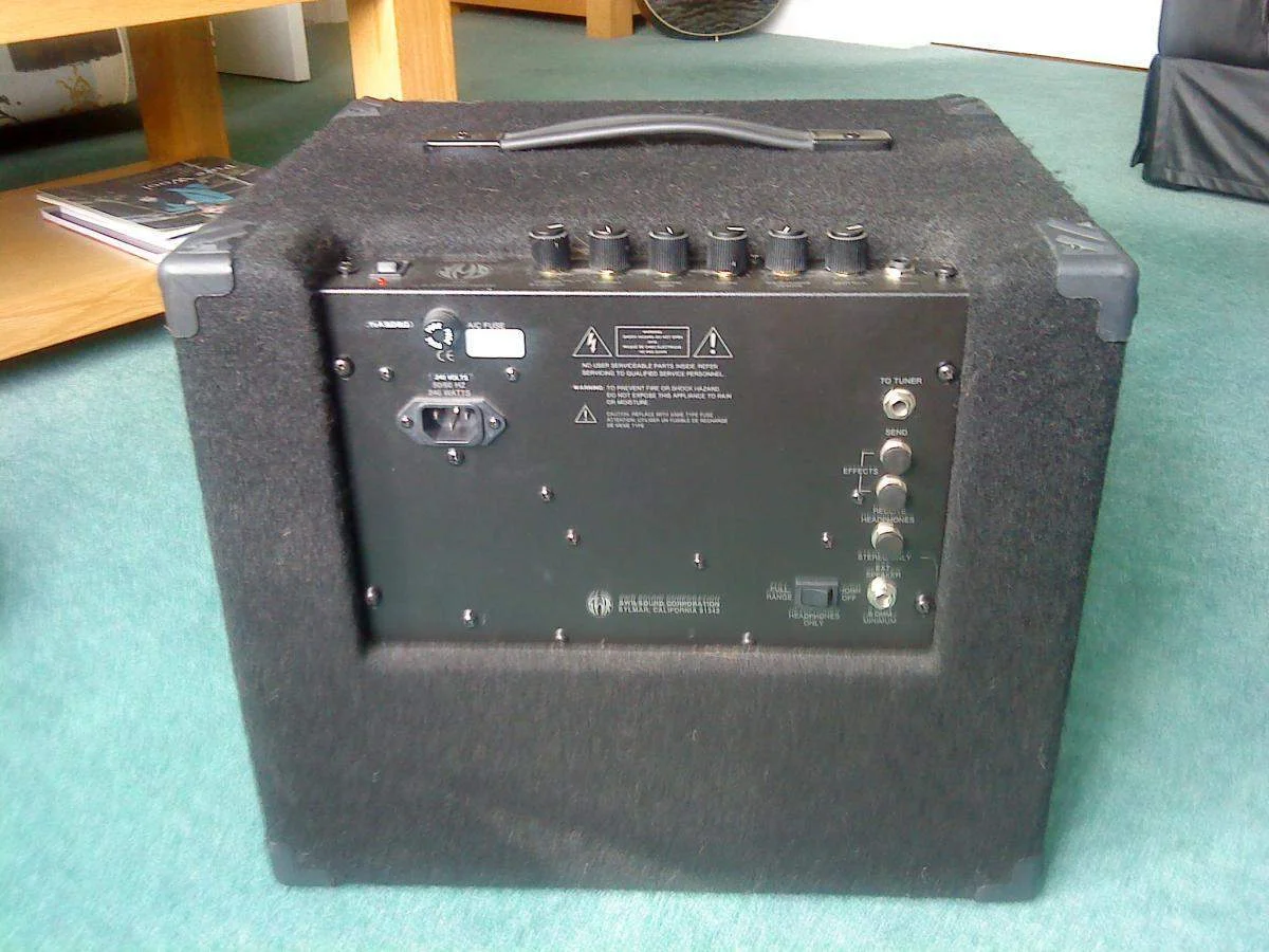 Hier geht meine Studiobox, die mich immer bei Aufnahmen begleitet (hat). Es handelt sich um eine kompakte 8 Ohm SWR Box, die 100 W verträgt. Das ist für Live-Anwendungen naturlement mager (für's Akustik-Trio ging's super), aber im Studio oder zu Hause natürlich der Bringer, weil sie schon bei erträglichen Pegeln fein komprimiert und einfach sagenhaft klingt.