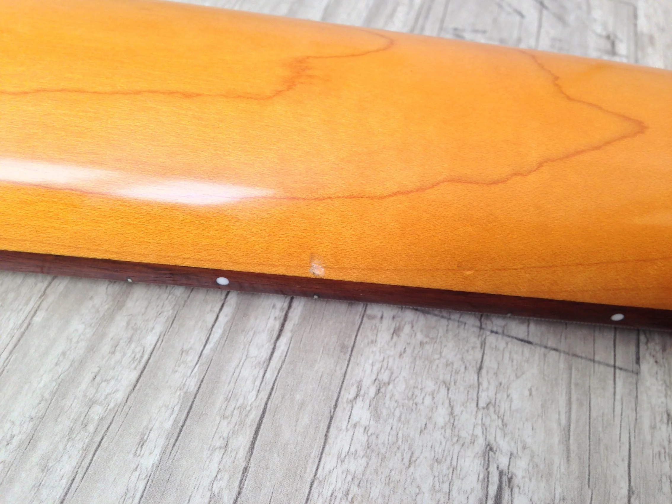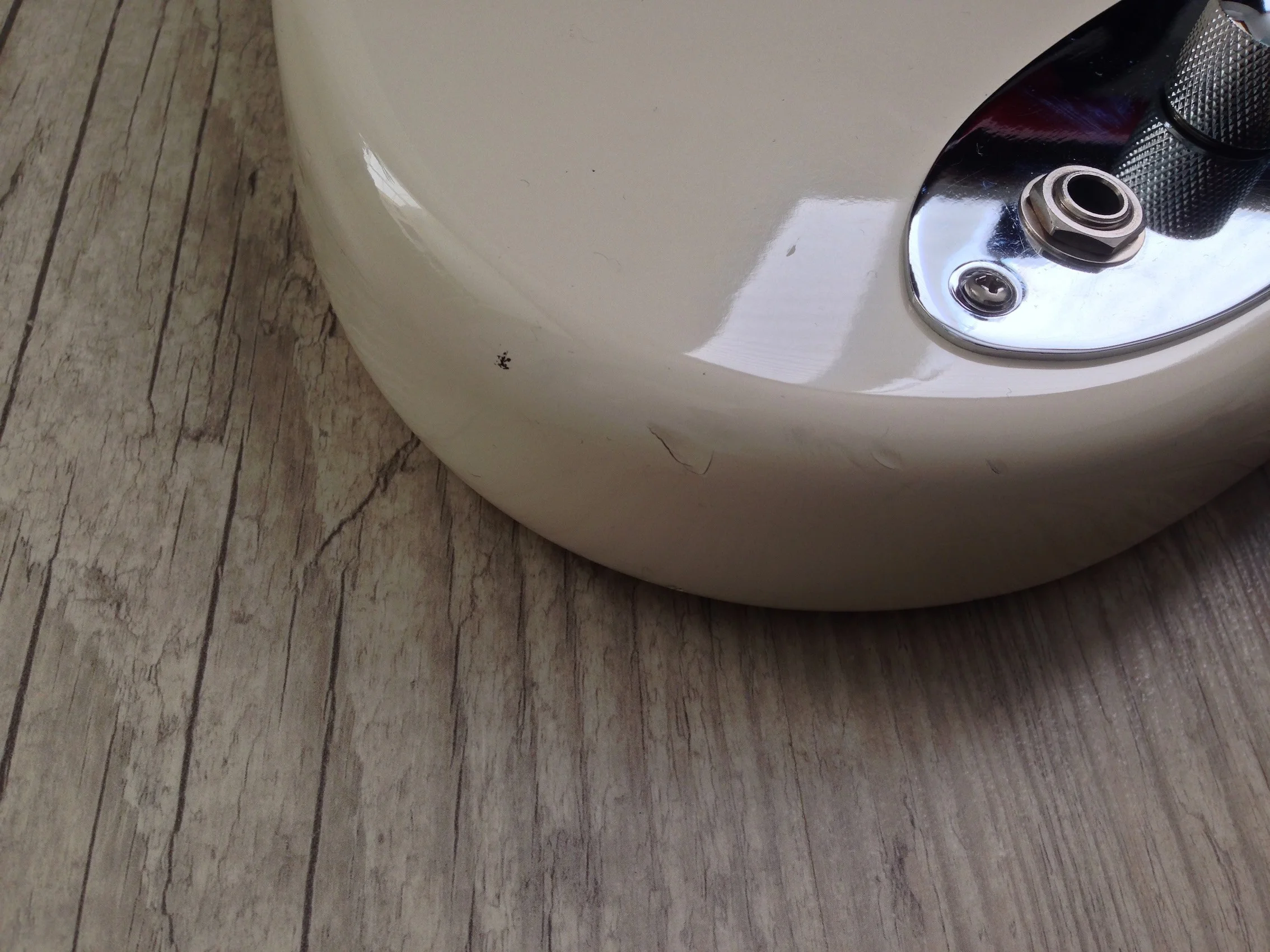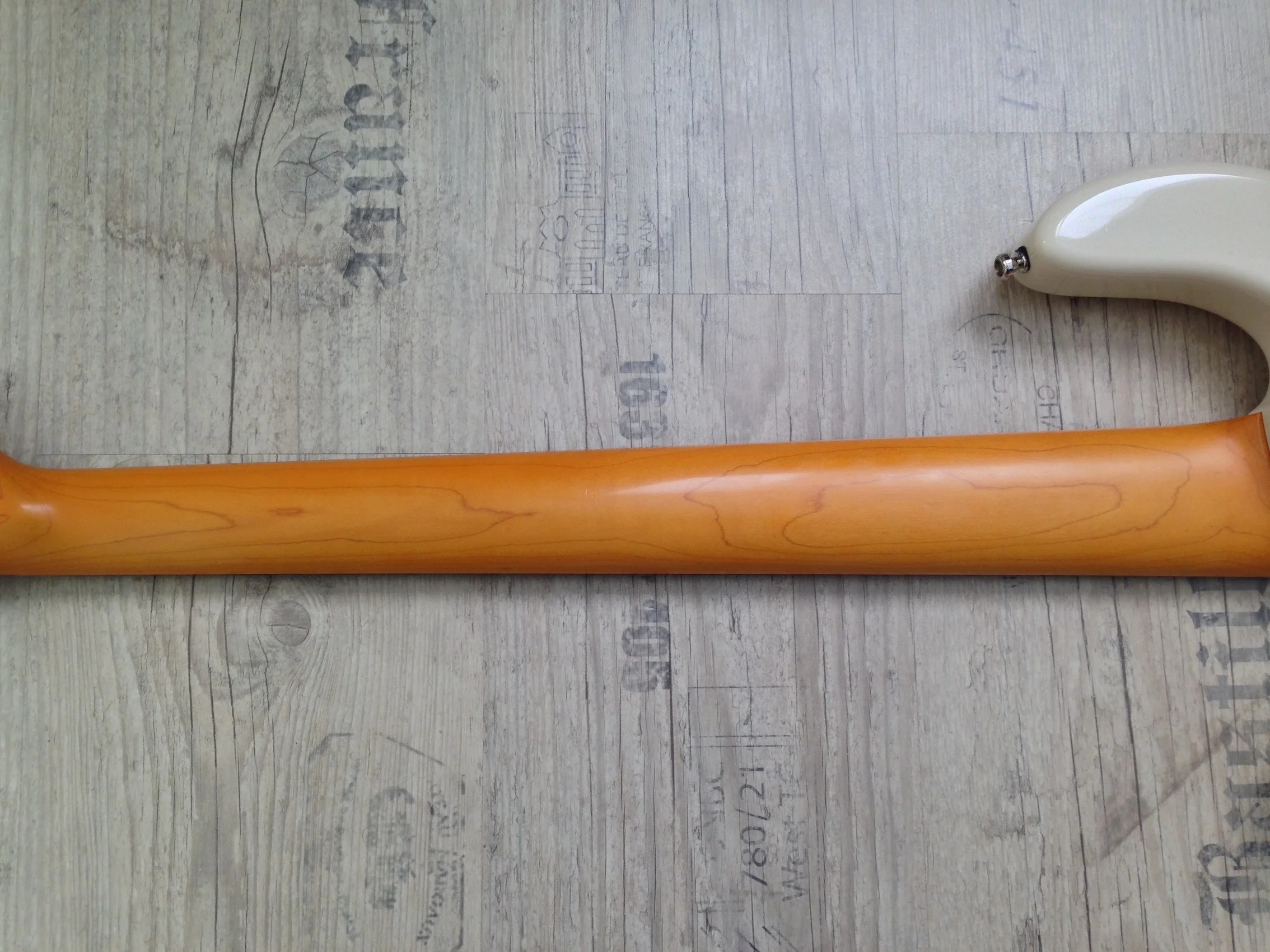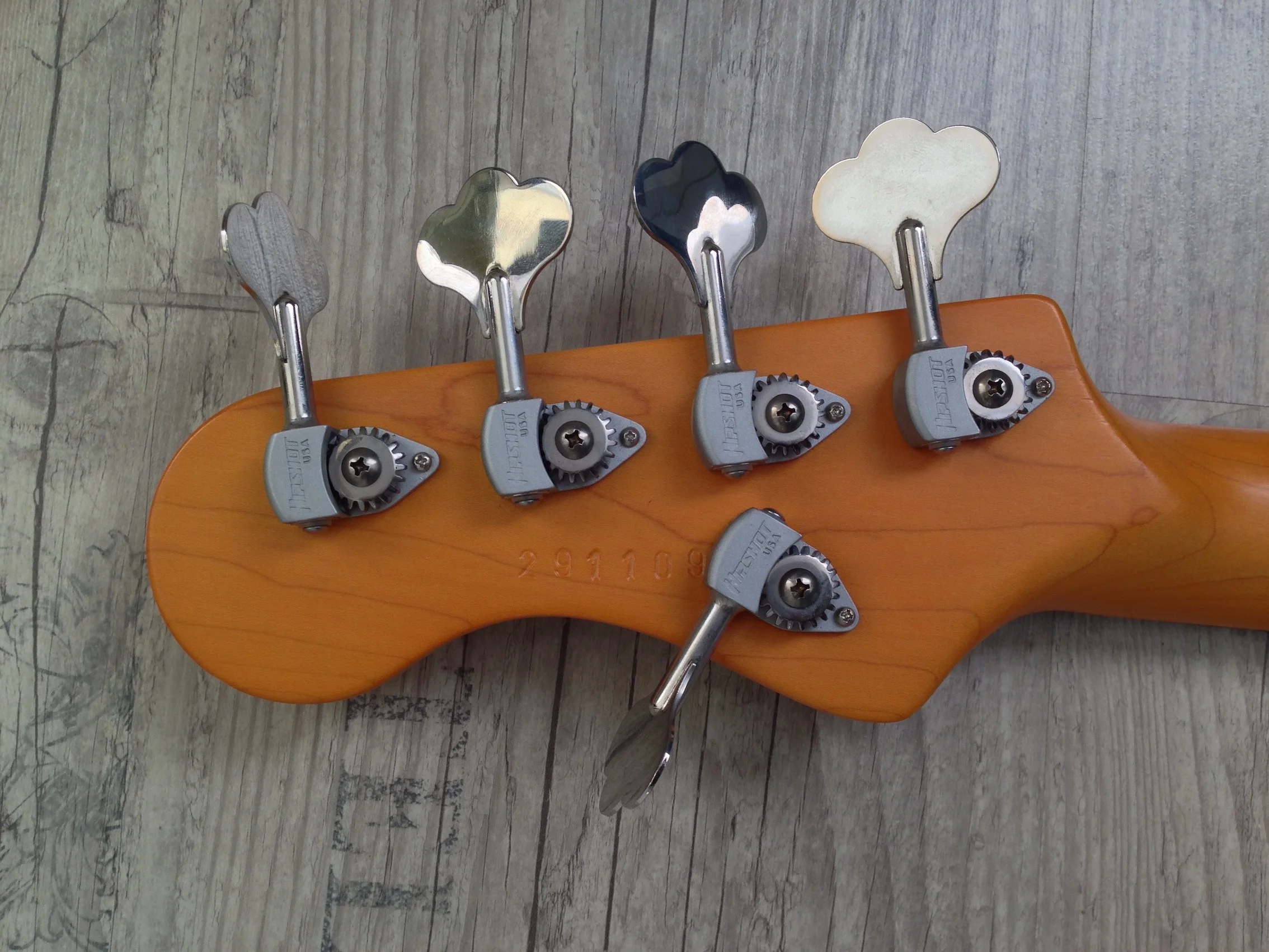 Hat einige kleinere Macken am Korpus, an der Kopfplatte und eine an der Halsrückseite, die mir beim Spielen nicht auffällt (siehe Fotos). Halsstab, Elektronik, Bünde sind tip top.