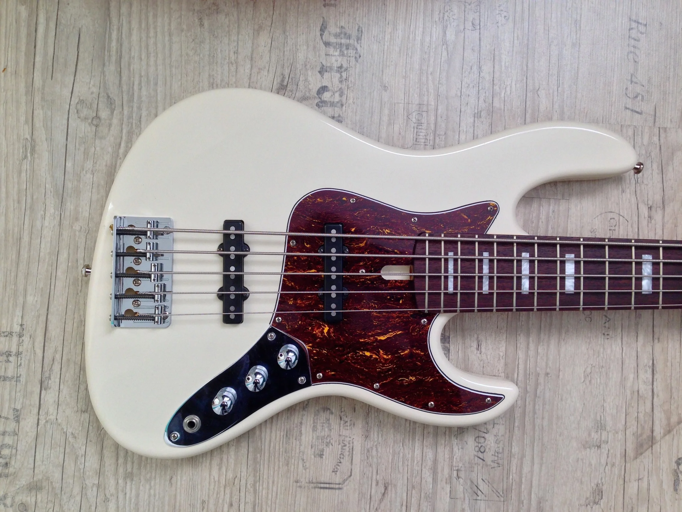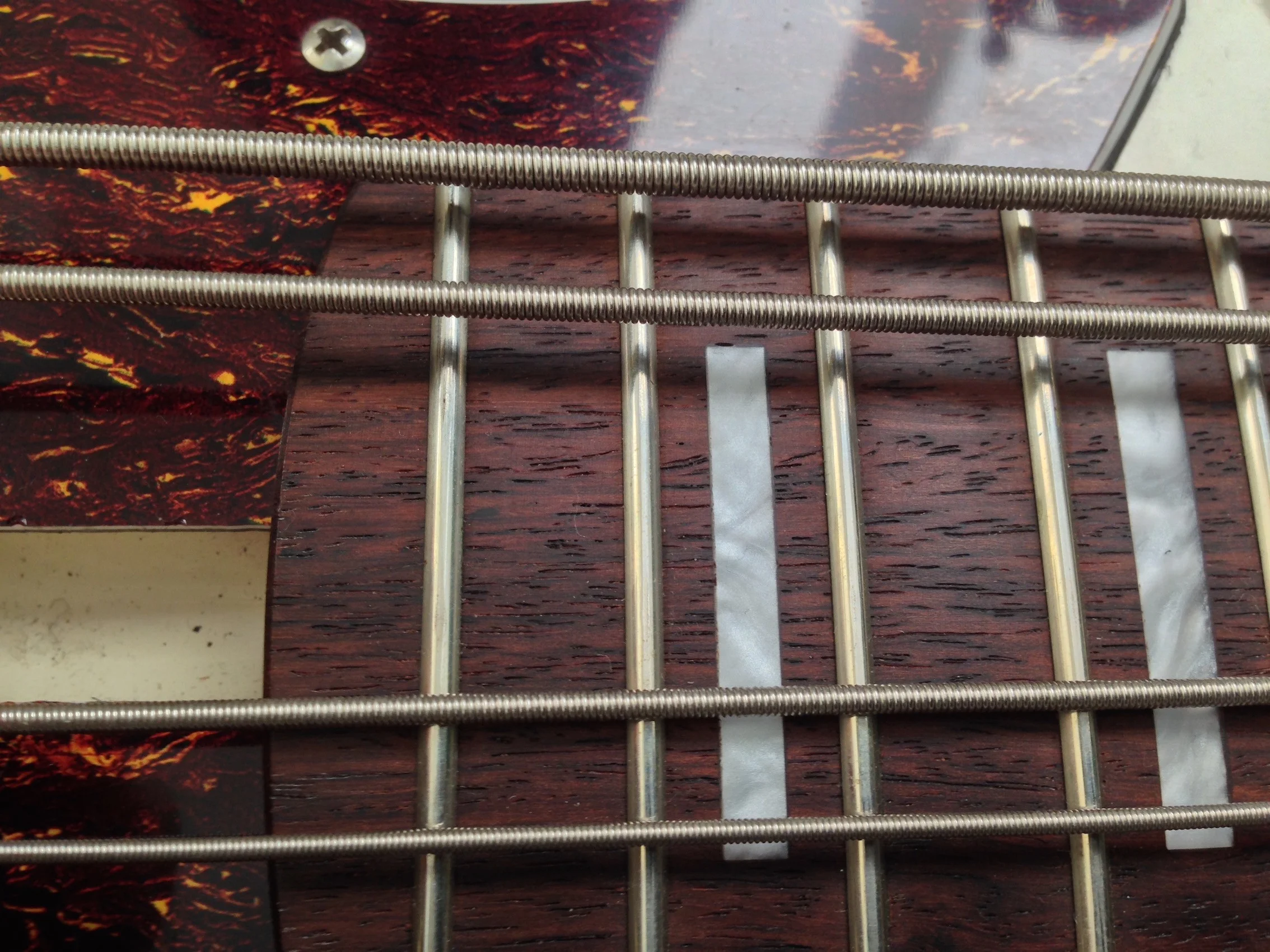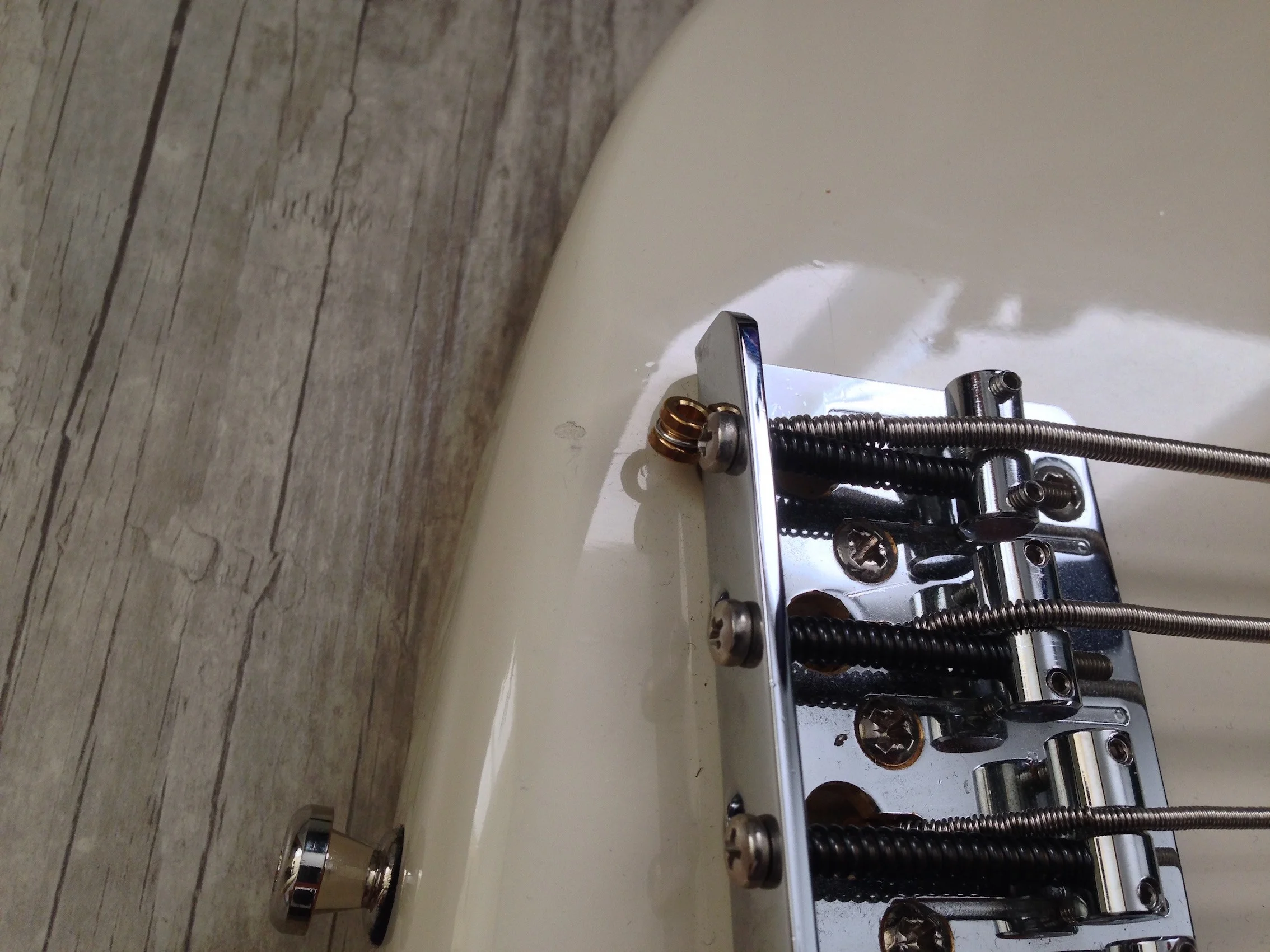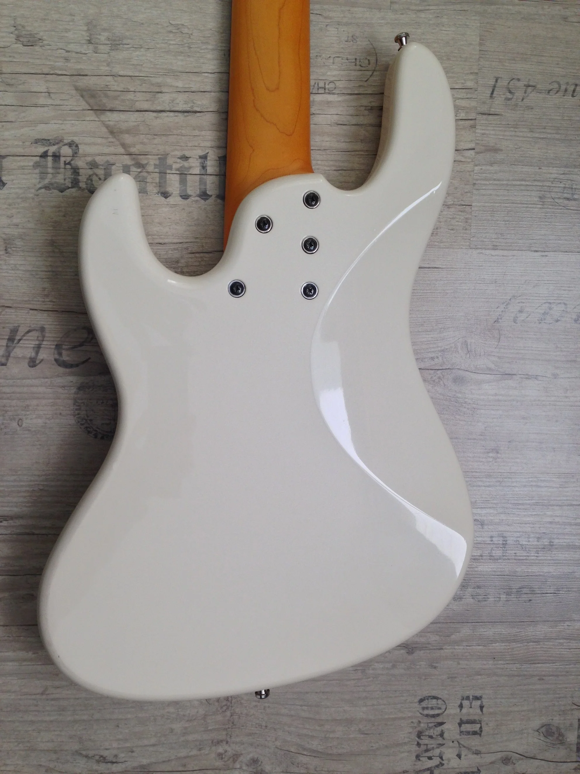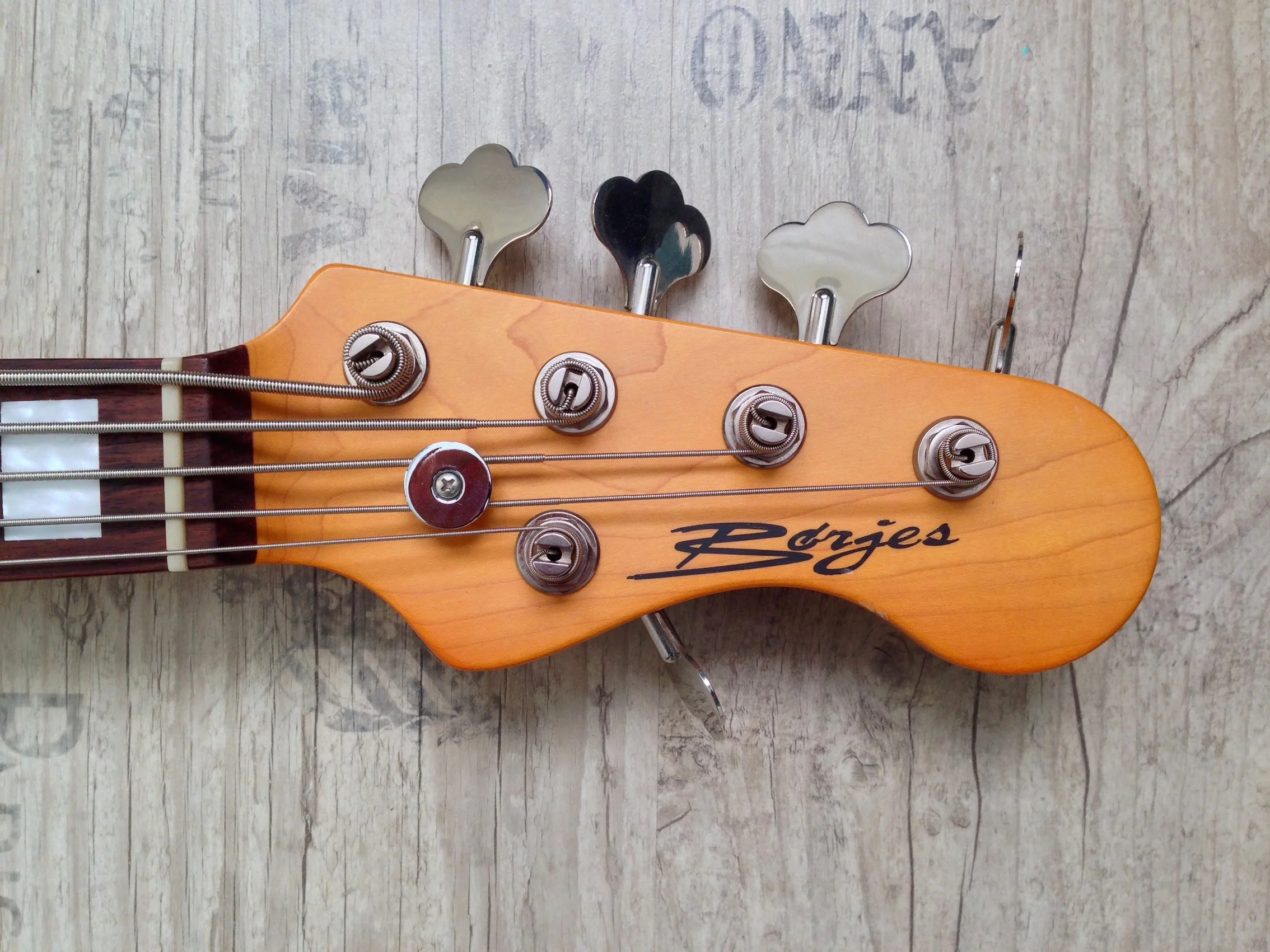 Hat einige kleinere Macken am Korpus, an der Kopfplatte und eine an der Halsrückseite, die mir beim Spielen nicht auffällt (siehe Fotos). Halsstab, Elektronik, Bünde sind tip top.