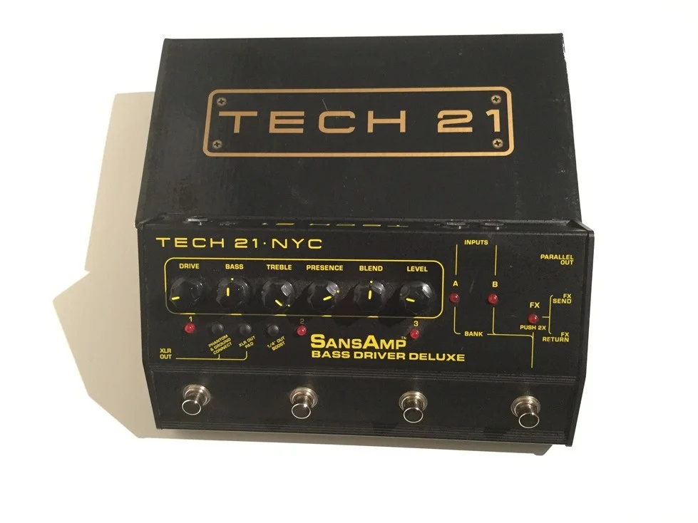 Immer am Puls der Zeit und die Bedürfnisse der heutigen Bassisten im Auge behaltend präsentiert Tech21 die Bass-Driver Deluxe D.I.-Box, die ultimative Waffe für den Live-Einsatz. Die Deluxe-Version besitzt 2 (umschaltbare) Inputs, man kann also 2 Instrumente gleichzeitig anschließen und mittels Fusschalter einen der Bässe anwählen. Pro Kanal können 3 verschiedene Sounds gespeichert werden (die Soundpresets können ebenfals mit Fusschalter abgerufen werden). Ausserdem hat man noch einen (Fuss-)schaltbaren, parallelen, regelbaren Effekteinschleifweg. Es versteht sich von selbst das alle Signalwege voll analog und dass die Fusschalter knackfrei arbeiten. Die Box kann wahlweise mit Phantomspeisung, optionalem 9-Volt-Netzteil oder Batterie betrieben werden.