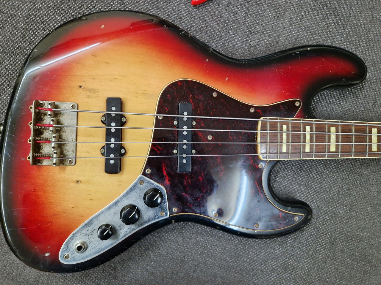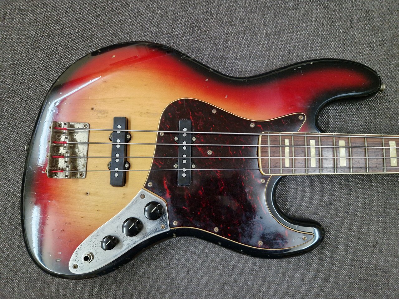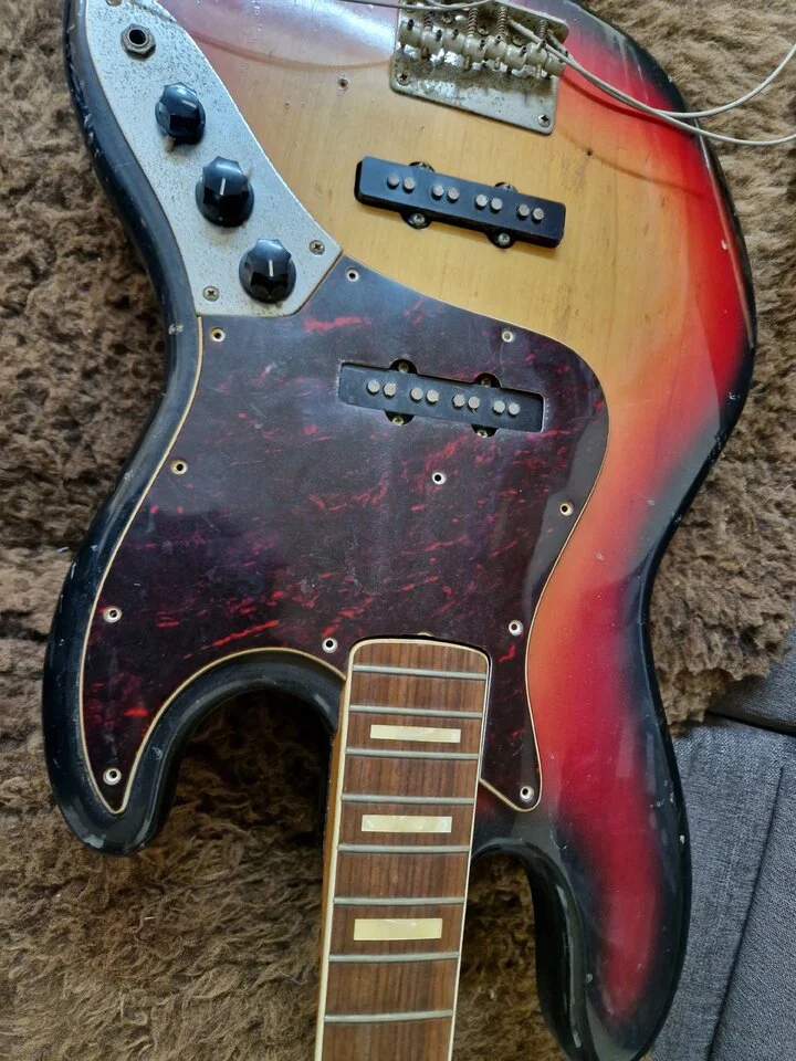 Es ist ein Aria Pro II Precise Bass aus dem Jahr 1977. Der Bass riecht nach Keller und wurde die letzten 20 Jahre vermutlich auch dort gelagert. Er ist ziemlich dreckig.