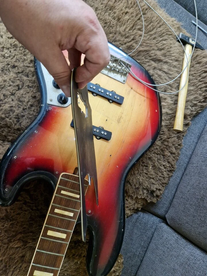 Das Pickguard ist leider übel verzogen und wellig. Ich hab sowas schon öfter bei alten Fender Bässen gesehen, auch dass sie schrumpfen und nicht mehr 100% passen.