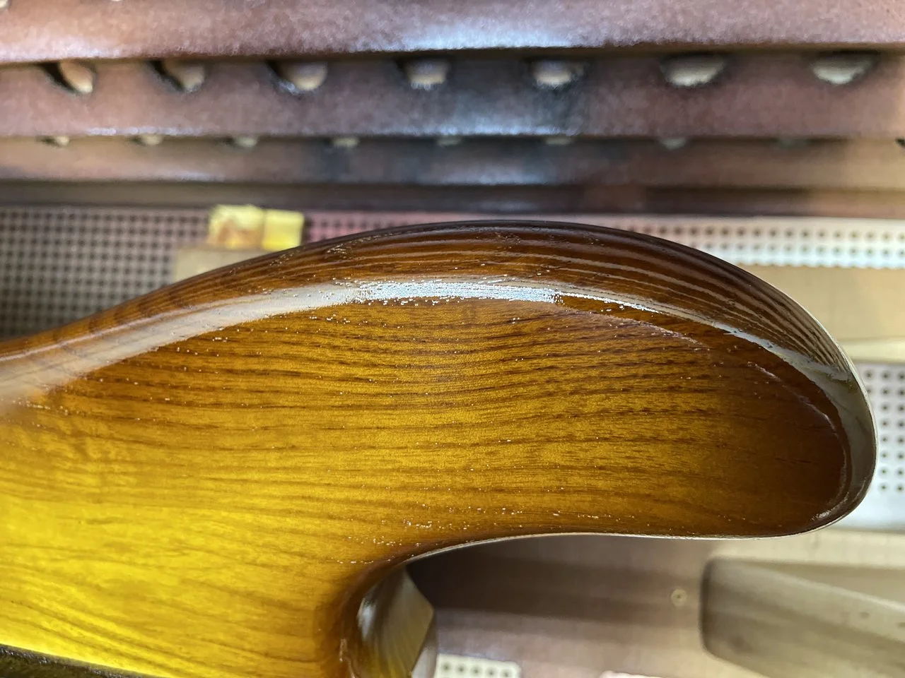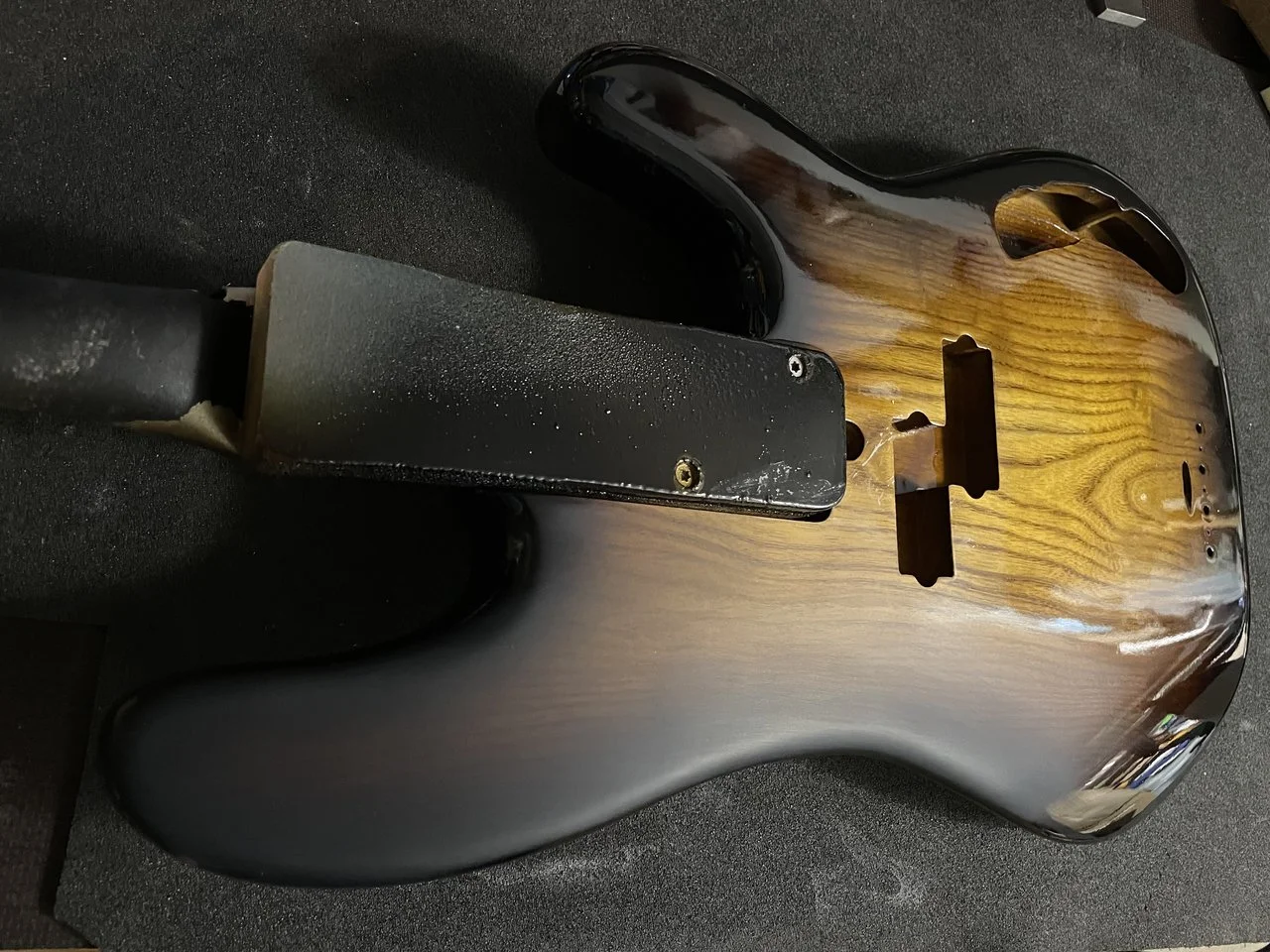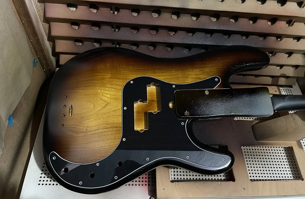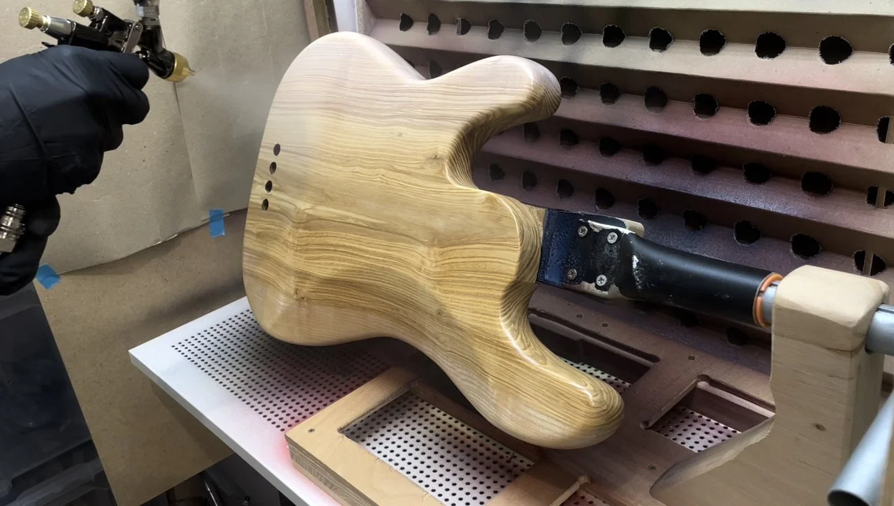 Also der 2K Wasserlack (Zweihorn Duocryl) ist nicht ganz so glashart und kratzfest wie der 2K aus der Dose auf meinem ersten Bass. Für Wasserlack trotzdem mega! Allerdings hab ich jetzt auch ca. 12 Schichten drauf und vorher waren’s nur 4-5 Schichten. Auf dem Hals sind es auch ca 5-6 Schichten und vorher waren es nur 2.