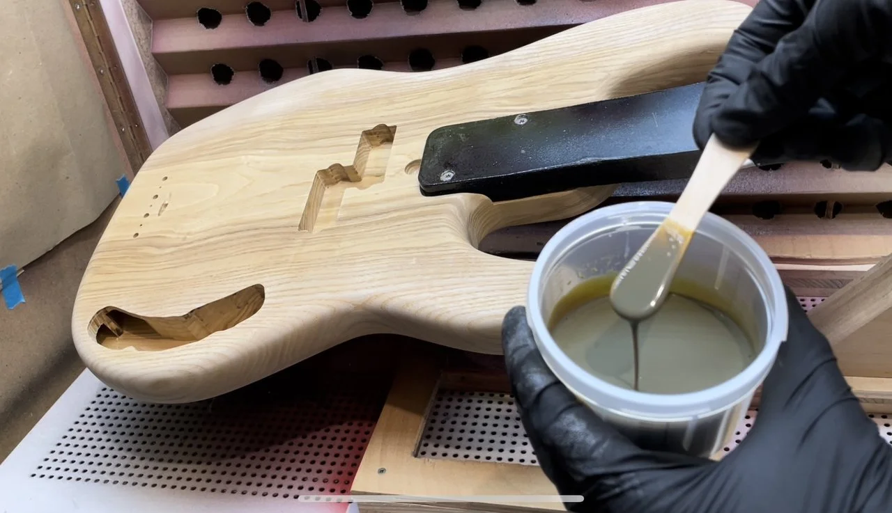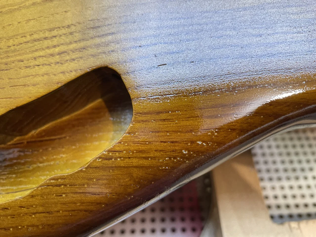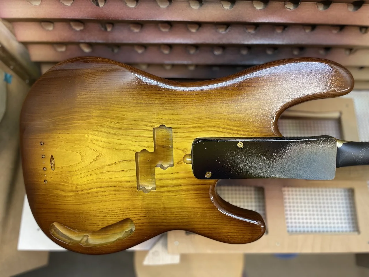 Also der 2K Wasserlack (Zweihorn Duocryl) ist nicht ganz so glashart und kratzfest wie der 2K aus der Dose auf meinem ersten Bass. Für Wasserlack trotzdem mega! Allerdings hab ich jetzt auch ca. 12 Schichten drauf und vorher waren’s nur 4-5 Schichten. Auf dem Hals sind es auch ca 5-6 Schichten und vorher waren es nur 2.