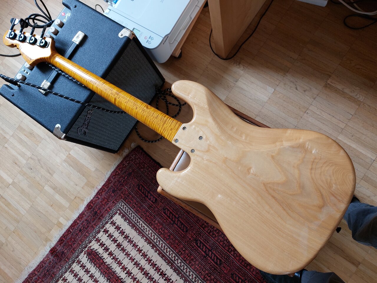 Mittlerweile ist der Hals gerichtet, wieder montiert, die Bünde sind abgerichtet, einige Kleinigkeiten am Saitenhalter korrigiert plus neue Saiten aufgezogen. Wenn der Hals oder der Spannstab nochmal Schwierigkeiten machen, ist deren Laufbahn dann allerdings leider endgültig zu Ende und gibt es einen neuen Hals aus Solinger Produktion. Aber erstmal schaue ich gedämpft optimistisch und an Seele und Beutel erleichtert in die Zukunft.