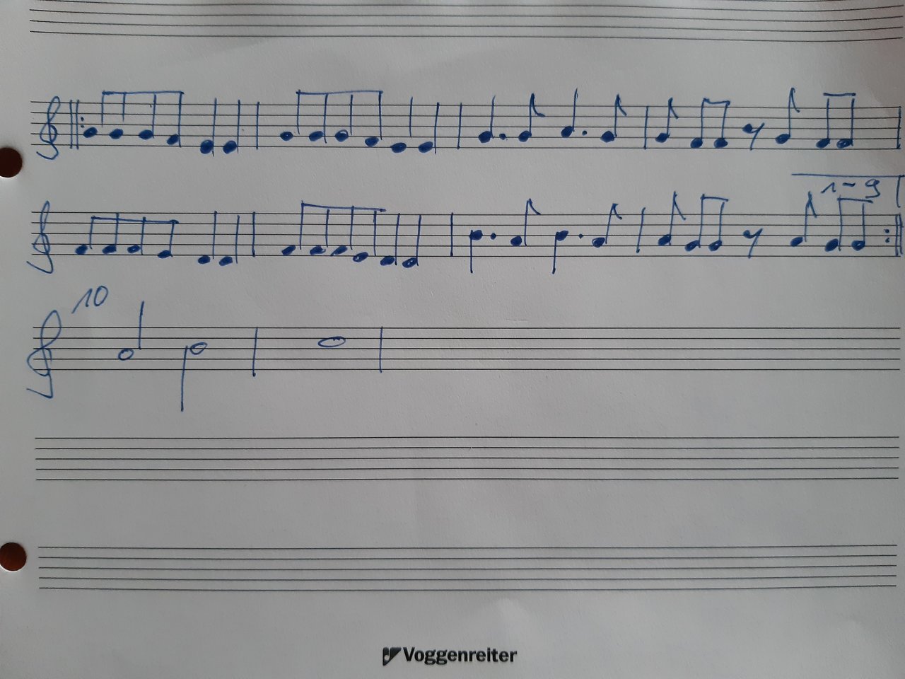 Und in Takt 4 bzw. 8 fehlt ne Achtel...Geile Idee! Aber die Noten sind nicht ganz richtig: die jeweils letzte Viertel in Takt 1 und 2 bzw. 5 und 6 müsste c bzw. h sein.