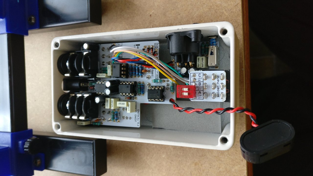 So sieht das ganze dann fertig mit DIP Switches aus. Die Schalterstellung auf dem Foto zeigt LPF und Boost deaktiviert, also nur LED aktiv.