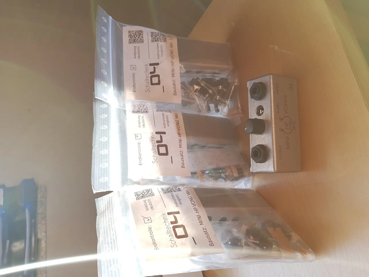 Für eventuelle VONG Interessenten: Vorhin hab ich ein Paket von Julian bekommen, das 5 VONG und 5 Mini VONG Bausätze enthält. Die normalen allerdings mit blanko Gehäusen, weils momentan keine bedruckten gibt.