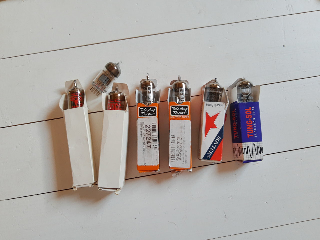 7 Röhren für Vorstufe - alle 12AX7 - abzugeben an experimentierfreudige. Ich verkaufe sie nur im "Set". Neupreise können ja gegooglt werde. Mein Schätzwert liegt bei weit über €100,-
