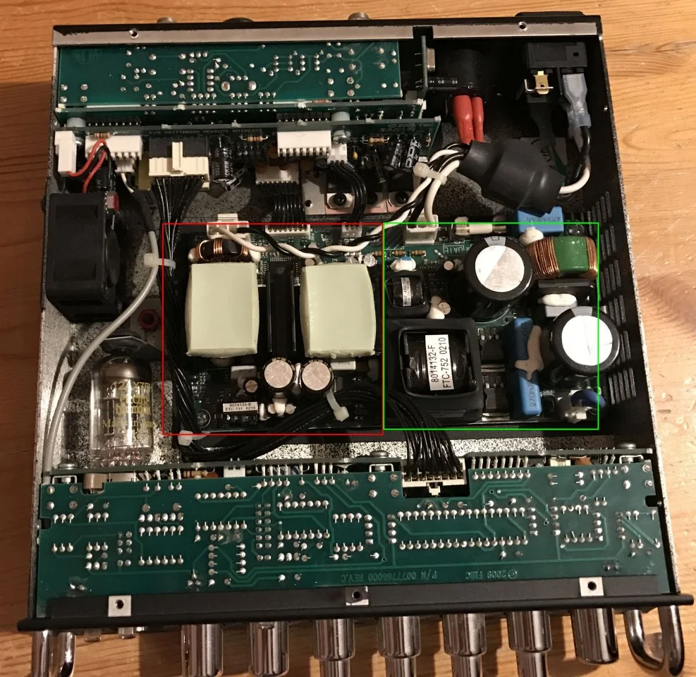 Das übliche Verhältniss im Netzteil für Peak/Dauerlast ist für einen Bassverstärker zu wenig. Denn wir brauchen kontinuierlich deutlich mehr Leistung als so ein üblicher Full Range Verstärker. Und auch die Spitzen sind nicht zu verachten. 1/8 kommt für den Pegel ja noch hin, aber eben nicht für die Dauerleistung. Eigentlich sollte das Netzteil so ausgelegt sein, daß es kontinuierlich die RMS Leistung der Endstufe liefern kann. Das tun aber die wenigsten. Denn das macht das Netzteil wieder deutlich größer. Hier mal ein Größenvergleich: 400W Endstufe zu passendem 400W Netzteil (Was auch mal über einen längeren Zeitraum die 400W liefern kann).
