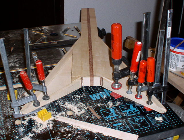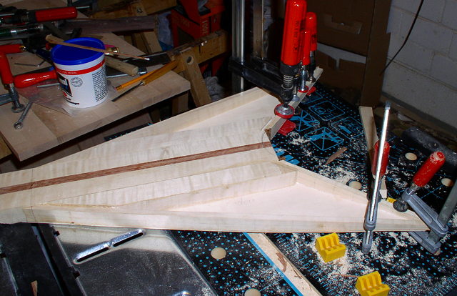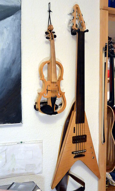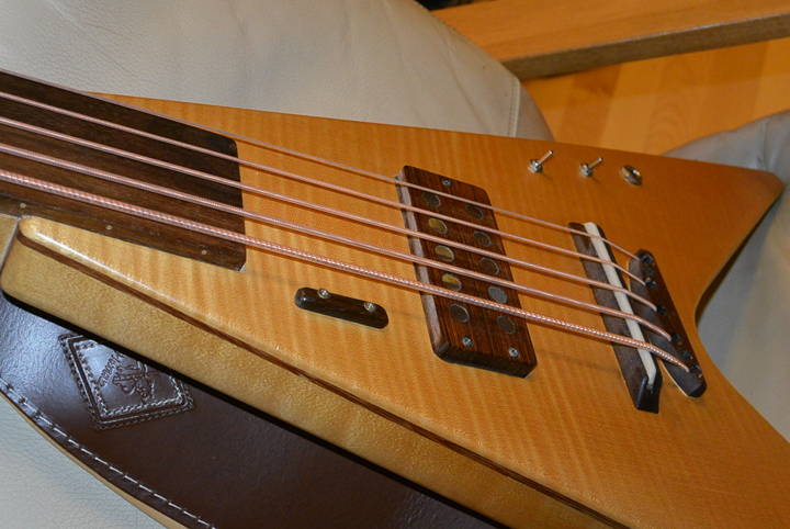 Mein Ahornbass - die V - ist ziemlich dünn und in den Flügeln hohl. Der Hals ist mehrstreifig, gesperrt und hat einen Kern aus Machiche (und ein dickes Griffbrett aus Katalox). Decke und Boden habe ich aus einem großen Ahorn-Boden für eine Akustikgitarre angefertigt.