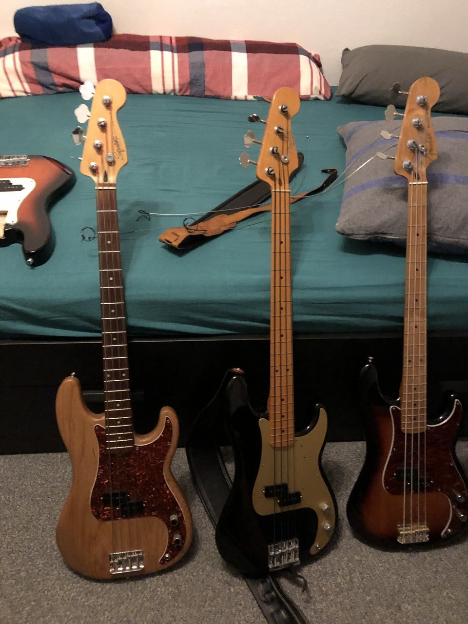 Wenn ich mal radikal reduzieren würde, käme ich wohl mit meinen drei roten Bässen aus - 1x Stingray, 1x Preci, 1x Jazzbass ....