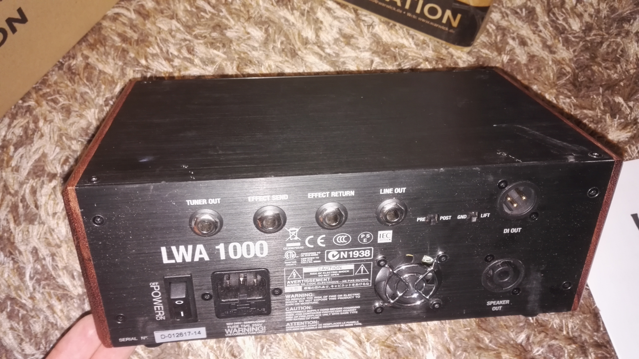Und das ist nur die Oberseite. Auf der Unterseite sind ebenfalls Kampfspuren, wie auch an den Seitenteilen. Die Macken sind mit den Fingern spürbar, als habe jemand den Amp immer in einem viel zu großen Rucksack mit dem Haustürschlüssel und einem Schraubenzieher zusammen transportiert. Für mich definitiv keine "leichten Gebrauchsspuren". Mein GK 1001 sieht nach 9 Jahren noch immer (fast) wie neu aus, obwohl er regelmäßig benutzt und rumgeschleppt wurde.