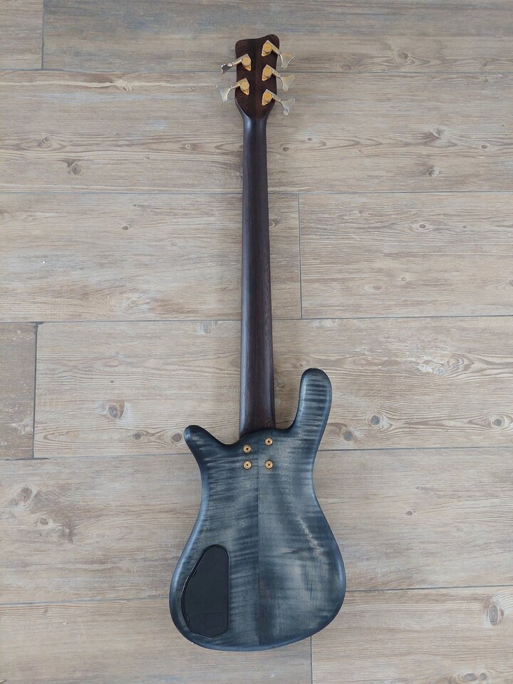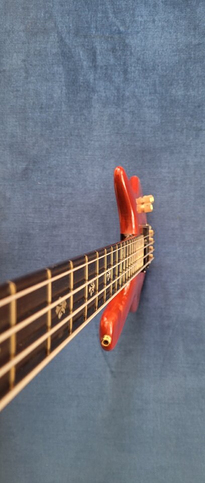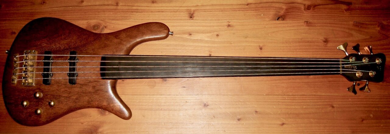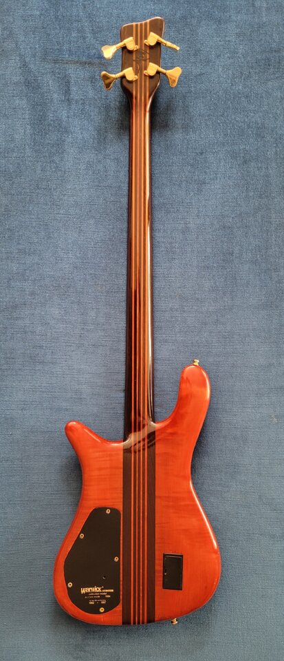 Nummer 9 der ersten Ltd Serie von 1987 (Warwicks 5. Geburtstag) limitiert auf 30 Stück; der wurde 1984 als Rohlinge vorgefertigt und 1987 dann fertig gestellt. Der Hals ist 9-fach gesperrt - sonst bei den 1980er Modellen 7-fach. Griffbrett Ebenholz mit Wappeneinlangen (habe das bei einem späteren fretless Thumb gesehen, den sich Hardy geschnappt hat).