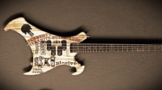 Schaut mal den Bass genau an, das steht SiKSplosive drauf. The SiKS ist meine Band, wie man unten in meiner Fußzeile sehen kann. Und "Herberts BuzzTard Inc.", weil Herbert mein Nachname ist.