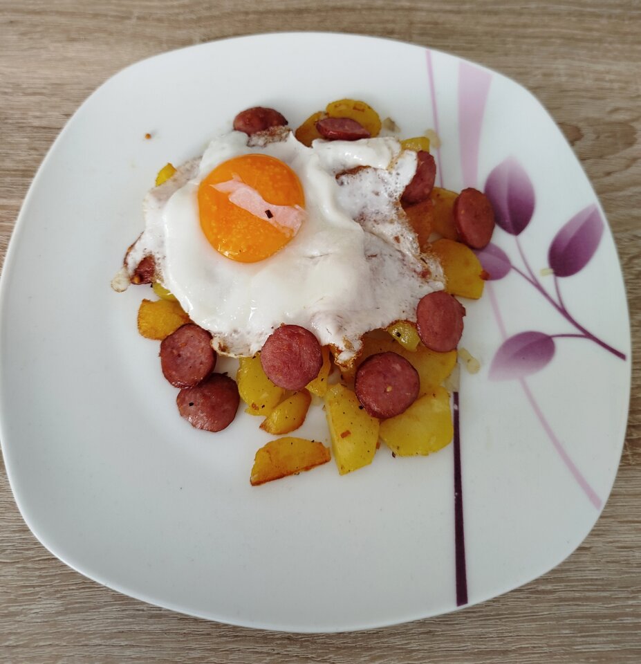 Knusprig gebratene Toffeln, mit geräucherter Wurst und einem Spiegelei.