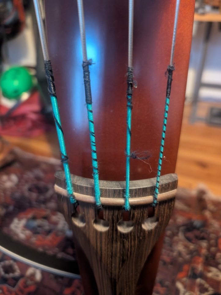 Am unteren Ende ist tatsächlich die Umspinnung der E und A Saiten hoch gerutscht!