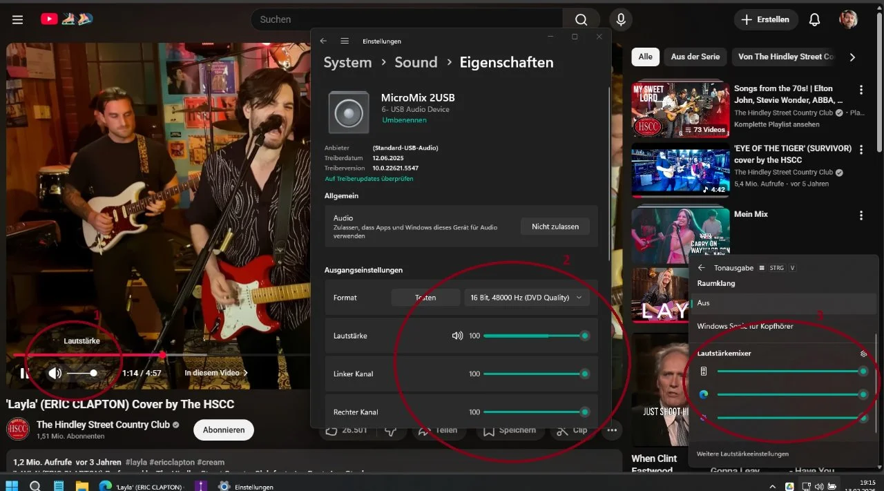 - "Lautstärkemixer" in Windows 11 mit Pegel für das Edge-Fenster in dem YT läuft