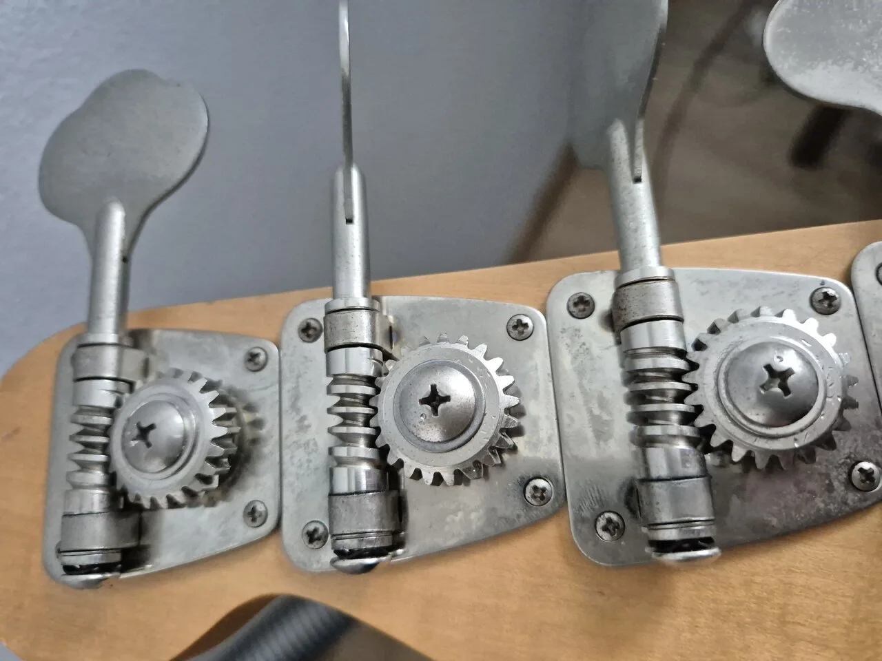 Das sind Copy Mechaniken, die an sehr vielen Japan Kopien von Matsumoku von Ende der 70er bis heute gebaut werden. Es gibt da im wesentlichen 3 versch ganz leicht versch. Modelle- hier mit Kreuzschraube für die Einstellung d. Gängigkeit alternativ mit Inbus und zuletzt ohne.Moin,