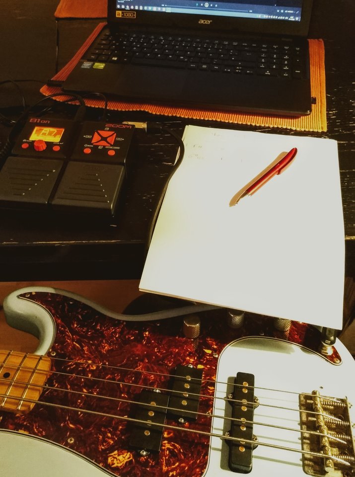Vom Bass ins Zoom B1on da kommt dann vom Laptop oder Handy der Track oder Playalong rein... geht auch aufm Sofa, aber mit “Beine hoch“ spielt sich nicht so konzentriert Bass, finde ich.