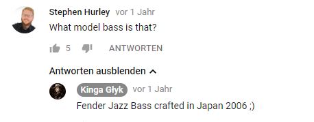 Mal ehrlich: wenn Du klingen willst wie Kinga Klyk, dann investiere die Kohle in Unterricht! Das ist alles extrem solide - Ton, Timing, Phrasierung... der Bass hat damit herzlich wenig zu tun! Ich behaupte mal, daß Du das zu 98% aus den meisten Jazz Bässen rauskriegst...Hat jemand so einen zu verkaufen?