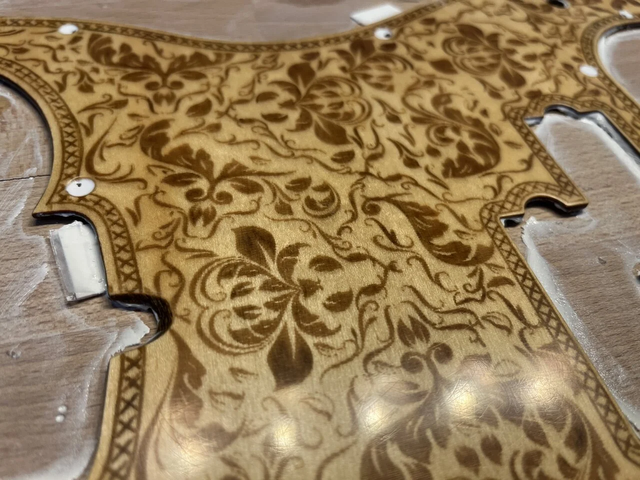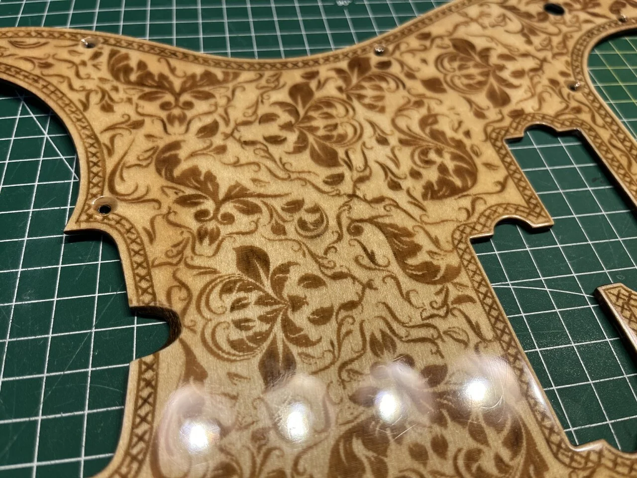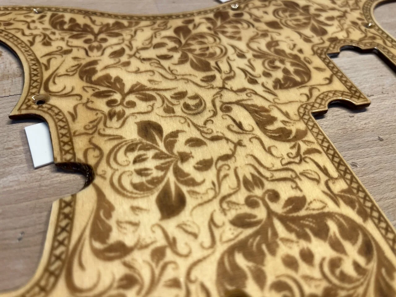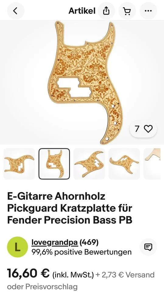 Das Pickguard, um das es geht, ist ein laser-geschnittenes Stück Ahorn-Sperrholz für 19€ aus China: