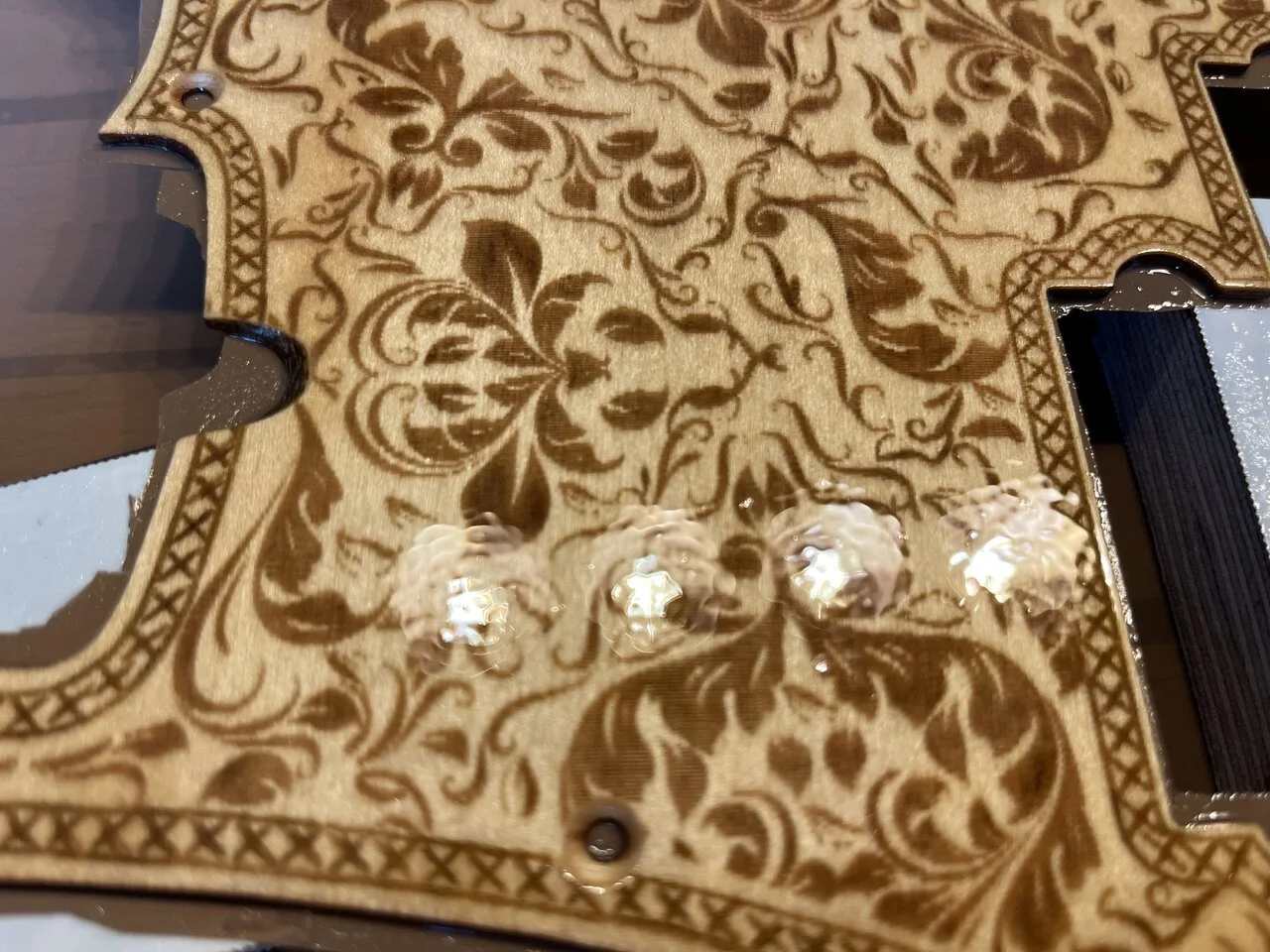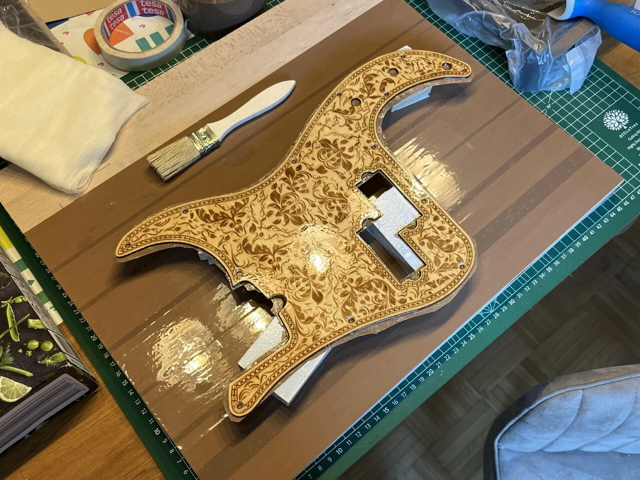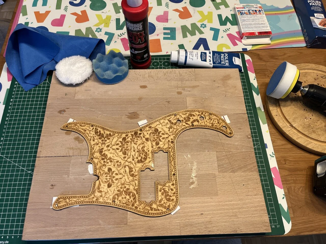 Das Pickguard, um das es geht, ist ein laser-geschnittenes Stück Ahorn-Sperrholz für 19€ aus China: