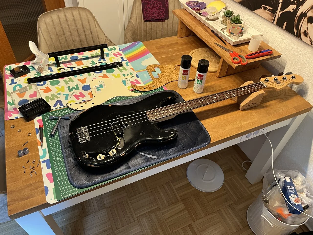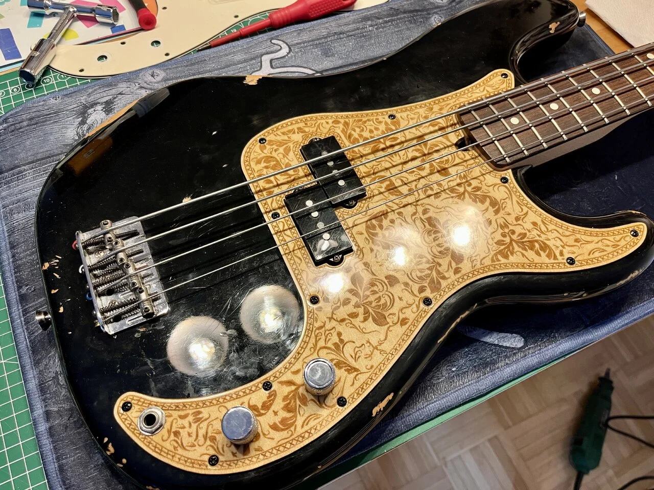 Der Body des Preci ist ohnehin so abgewetzt, dass ich mir einfach zugute halte, dass ein hochglänzendes und spiegelglattes Pickguard da gar nicht drauf gepasst hätte