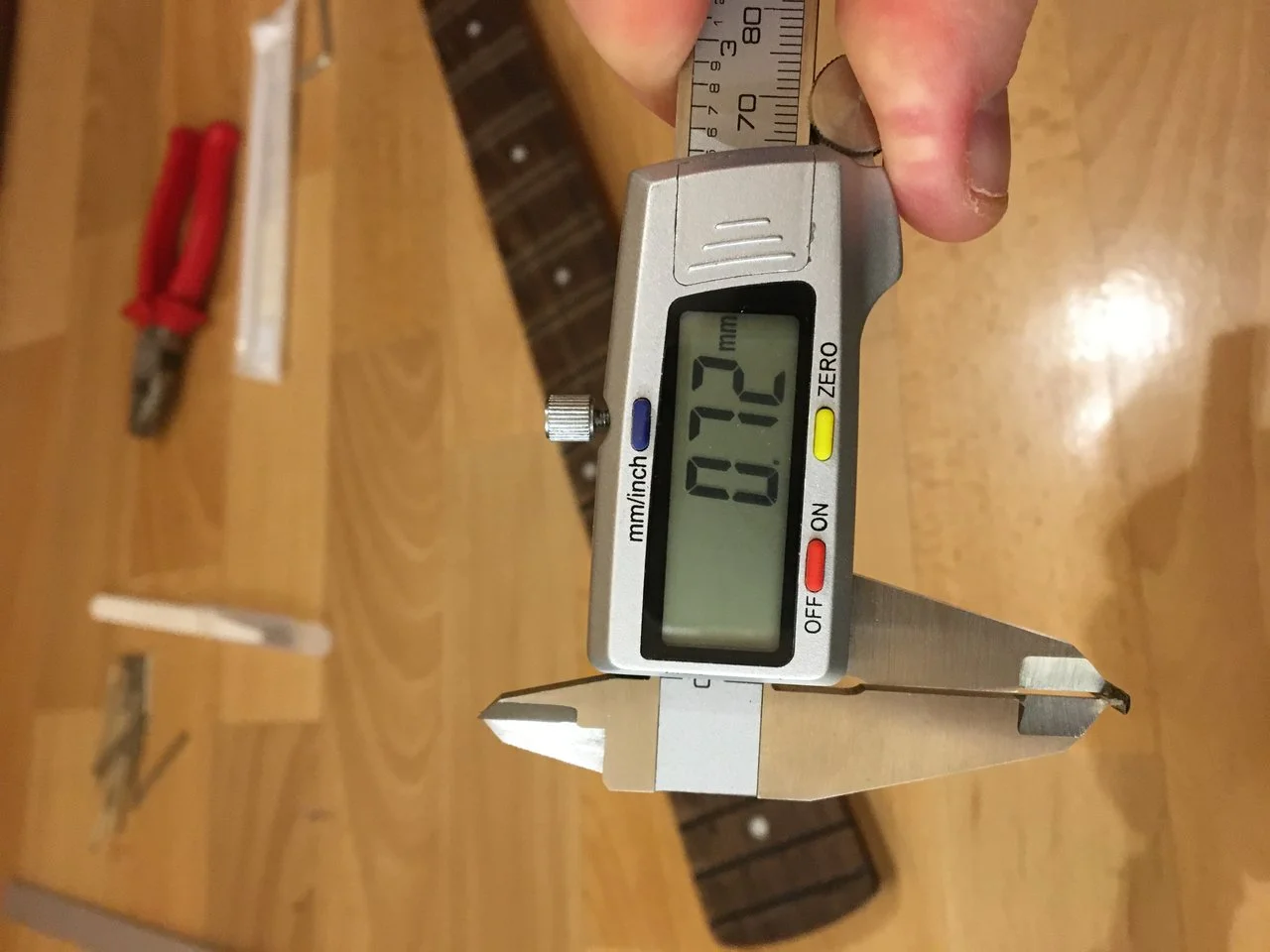 Die Bundkronen sind erstmal egal. Die 0.76mm glaube ich nur dann, wenn sie die "Noppen" mit einbeziehen. Es geht aber um die Dicke ohne diese Noppen - denn die sollen den Bund ja im Holz verankern, und nach dem richtet man die Schnittbreite aus.