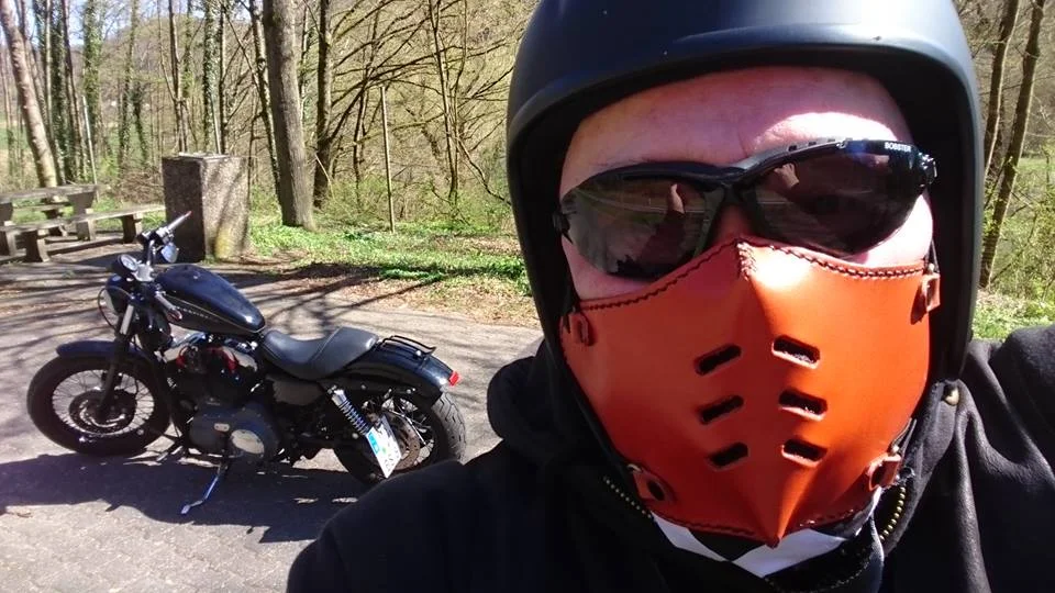 Eine Ledermaske. Die schützt deutlich besser gegen Insekten und Steinchen als ein Tuch. Habe die auch in schwarz.Was hast Du denn da für einen Mundschutz?![]()