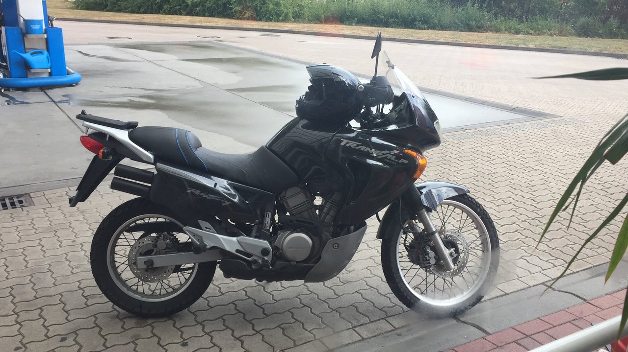 Die Gelsitzbank von der schwarzen hat der Verwerter mir gelassen, da ich noch eine Originale hatte zum Austausch. Die blaue Transalp bekommt demnächst noch Heizgriffe (hatte ich bei der schwarzen zum ersten Mal und das war echt angenehm bei der Überführungsfahrt im Regen!), das Motorrad-Navisystem, das ich letztes Frühjahr schon gekauft hatte und bisher nur im Auto genutzt hatte, wird verkabelt, schickere, schmalere Handprotektoren aus dem Zubehör kommen dran, sowie Stahlflexbremsleitungen, Sinther-Beläge und progressive Gabelfedern für den besseren Stopp mit Sozia. Die Kofferträger hatte der Verkäufer noch montiert vor der Übergabe. Kauf und Zulassung der Maschine mit allen geplanten An-/Umbauten sind von den Versicherungsleistungen des Unfalls finanziell gedeckt. Jetzt wäre mir noch nach einem Federbein aus dem Zubehör und einem Endtopf aus dem Zubehör (der steht wie die letzten Jahre aber immer ganz am Ende der Liste und wird regelmäßig von anderen Anschaffungen überholt).