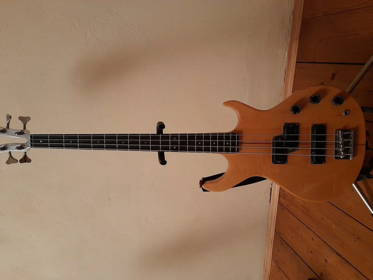Ibanez Mahagoni body, mit dem damals üblichen DiMarzio PU. Gekauft habe ich ihn in München am Gärtnerplatz. Das Geschäft gehörte Fäx und ich dachte mit mein 18 Jahren, ich hätte einen günstigen gebrauchten Fender Precision Bass erstanden. Wie wird das später herausstellte, hat mich Fäx übers Ohr gehauen. Aber gut, der Bass ist gut, nicht schwer und klingt ordentlich und lässt sich prima spielen. Aus sentimentalen Gründen immer noch bei mir.