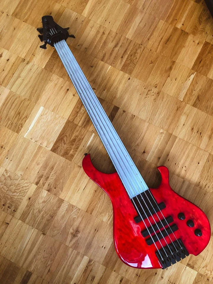 Könnte auch ein älterer Karlsson sein. Leider ist auf dem Foto die Kopfplatte nicht zu sehen. Ich spiele einen Karlsson und die Form kommt mir bekannt vor. Die Anordnung der Pickups. Allerdings sind bei mir die fünf Potis zu dreien zusammengefasst, davon zwei mit Doppelfunktion.