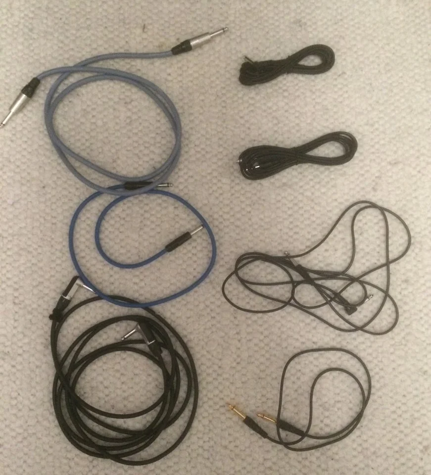 Kabel sind im Proberaum. Hier sind die wenige, die ich zuhause gefunden habe. (Siehe Foto) Links sind die «richtigen». Von oben nach unten: