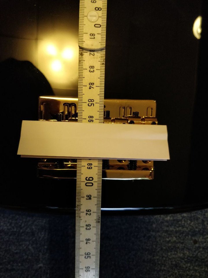 Wollte ich gerade nachlegen.Es geht nicht um die Mitte des 12. Bundes (also da wo die Punkte sind), sondern um das Bundstäbchen, was sich auf dem Foto ungefähr bei 432 mm befindet. Verdoppelt macht das 864 mm. Das ist ziemlich genau Longscale-Maß, und ungefähr da steht auch der Saitenreiter auf dem Foto. Alles richtig also...