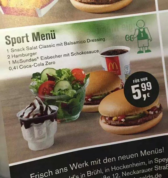 Da hasste vielleich die zwei Burger weg, bleibt immer noch der Eisbecher. Über den Zuckergehalt des Balsamicodressings schweigen wir mal.Ich gehe davon aus, dass dies der Hinweis ist, dass man die Mahlzeit mit ausreichend Sport (>2h) kompensieren muss.