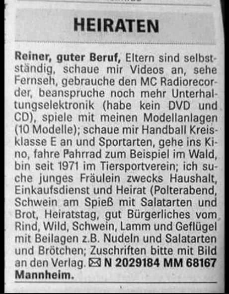 Eine passende Frau wird nicht gesucht. Es soll ein junges Fräulein werden, da gibt es bestimmt ein auschlaggebenden Unterschied.