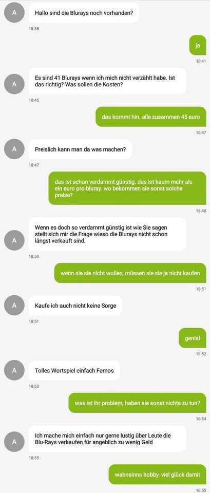 Genau so hab ich das auch mal gemacht. Nur ohne das Blockieren, die Konversation danach war nämlich sehr witzigUser blockieren und wenns nötig ist preis runter setzen und freuen, wer ihn nich bekommt.